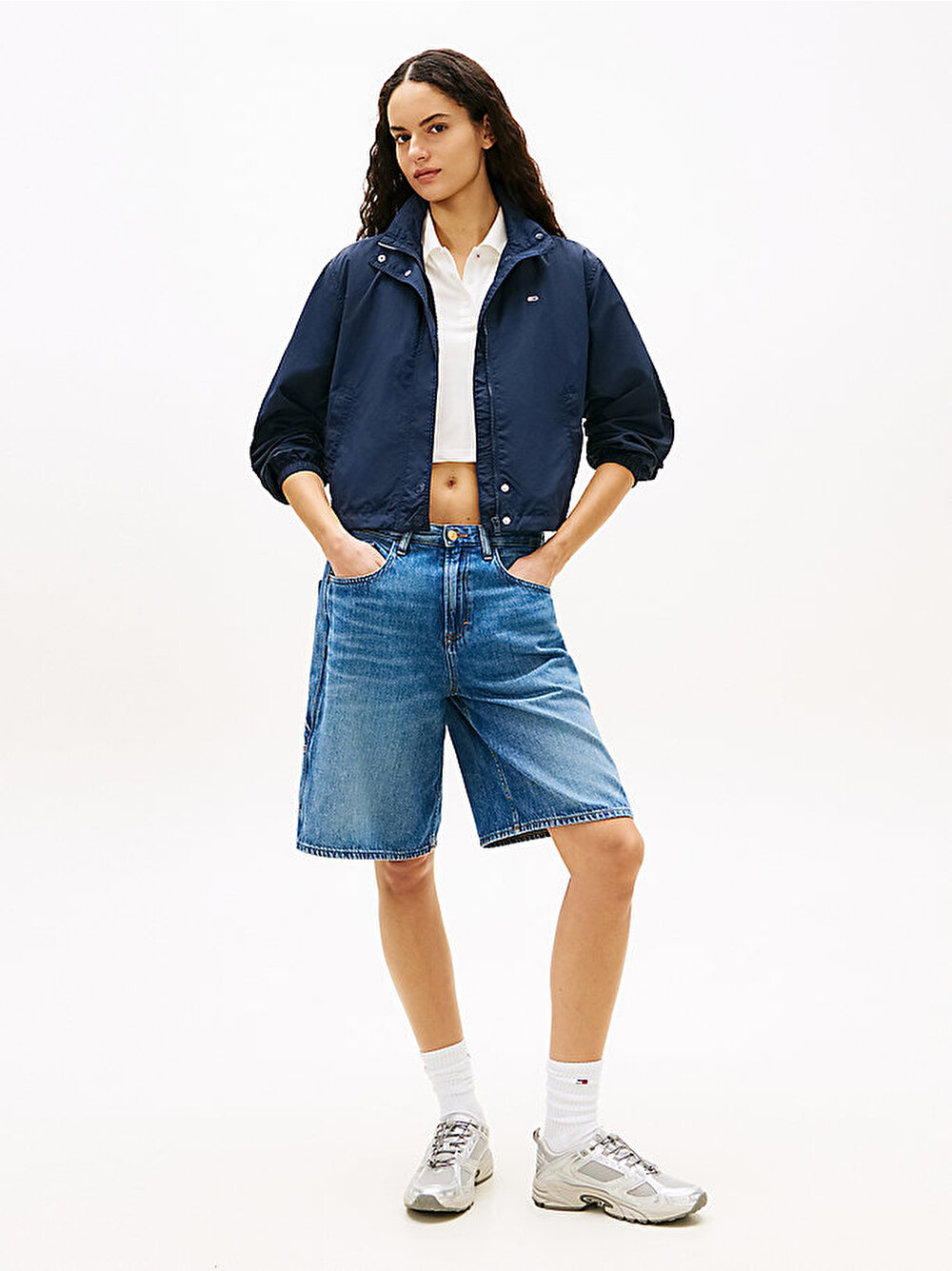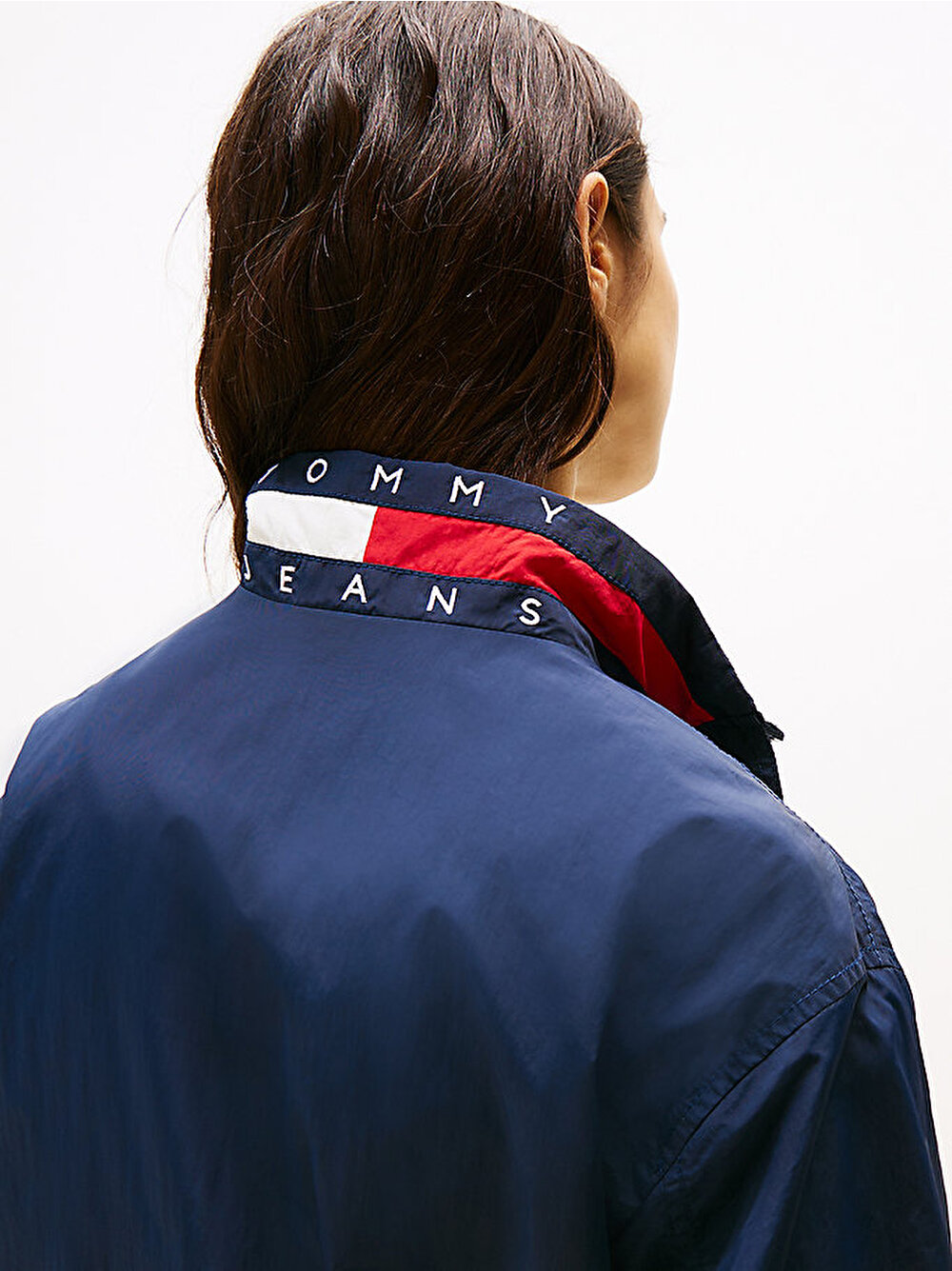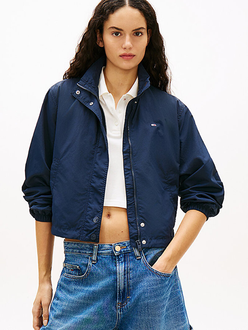 Su tutmayan krinkıl naylondan üretilen ve yaka kısmında iddialı bir marka vurgusu taşıyan bu tam boy fermuarlı ceket, değişken havalar için ideal bir dış katmandır.