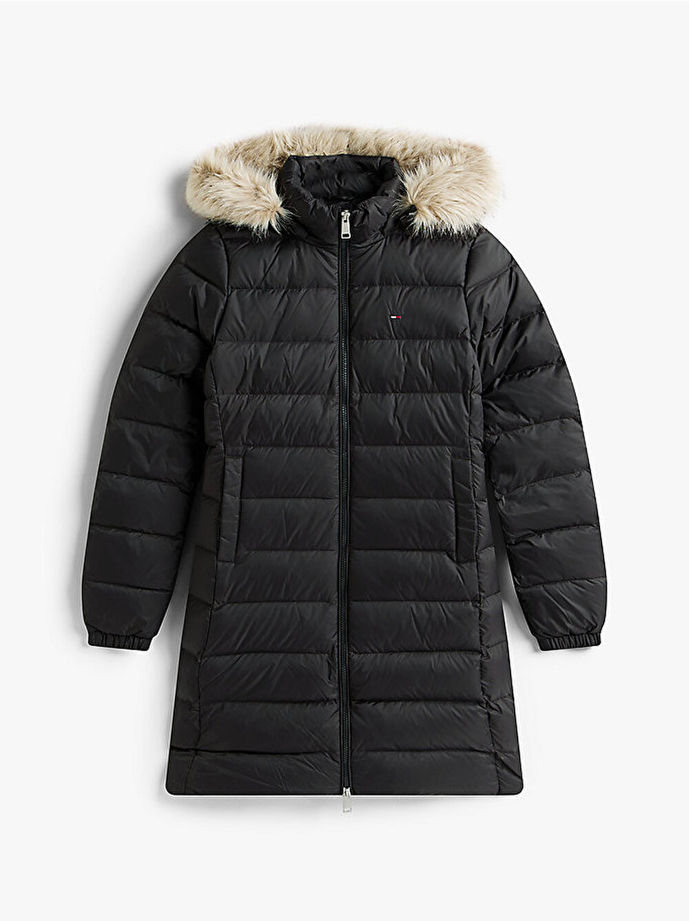Parlak dış yüzeyi ve kapüşonundaki suni kürk detayıyla bu kaz tüyü dolgulu mont, rüzgarlı günlerde konfor sağlar.