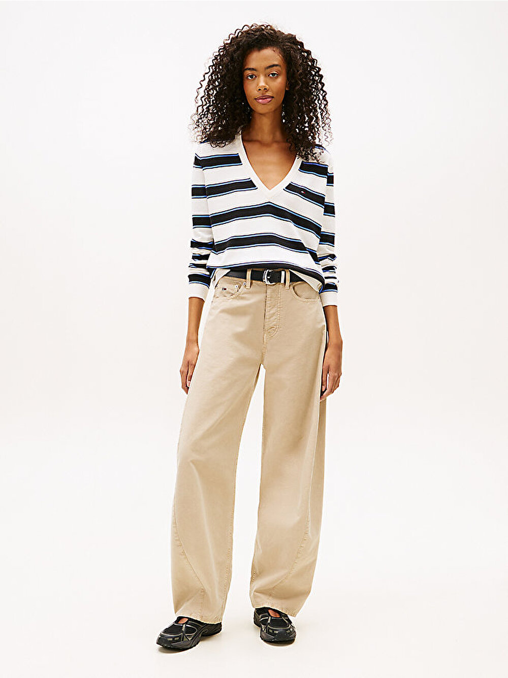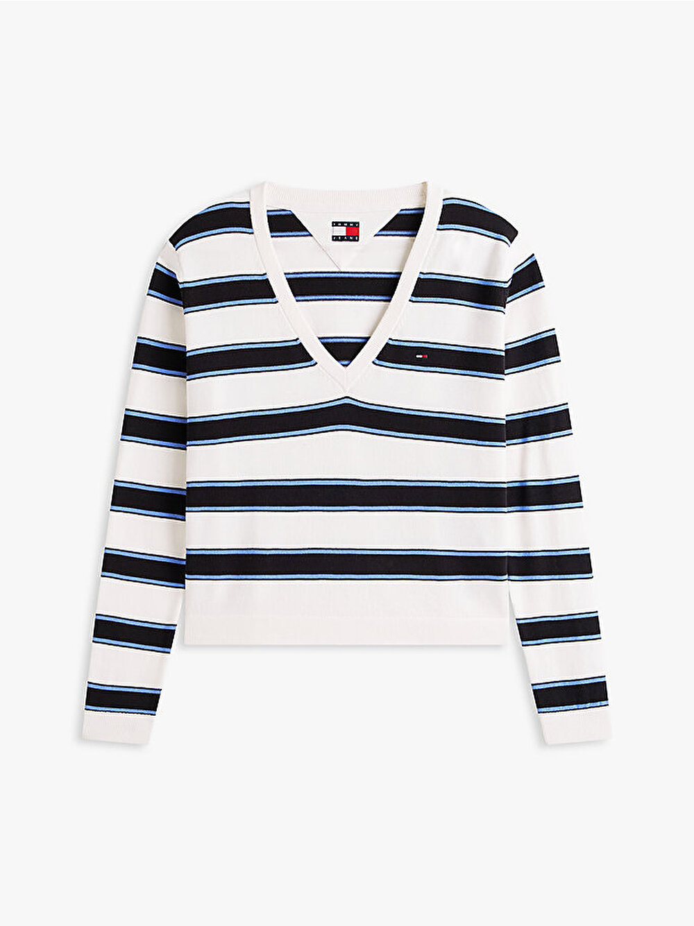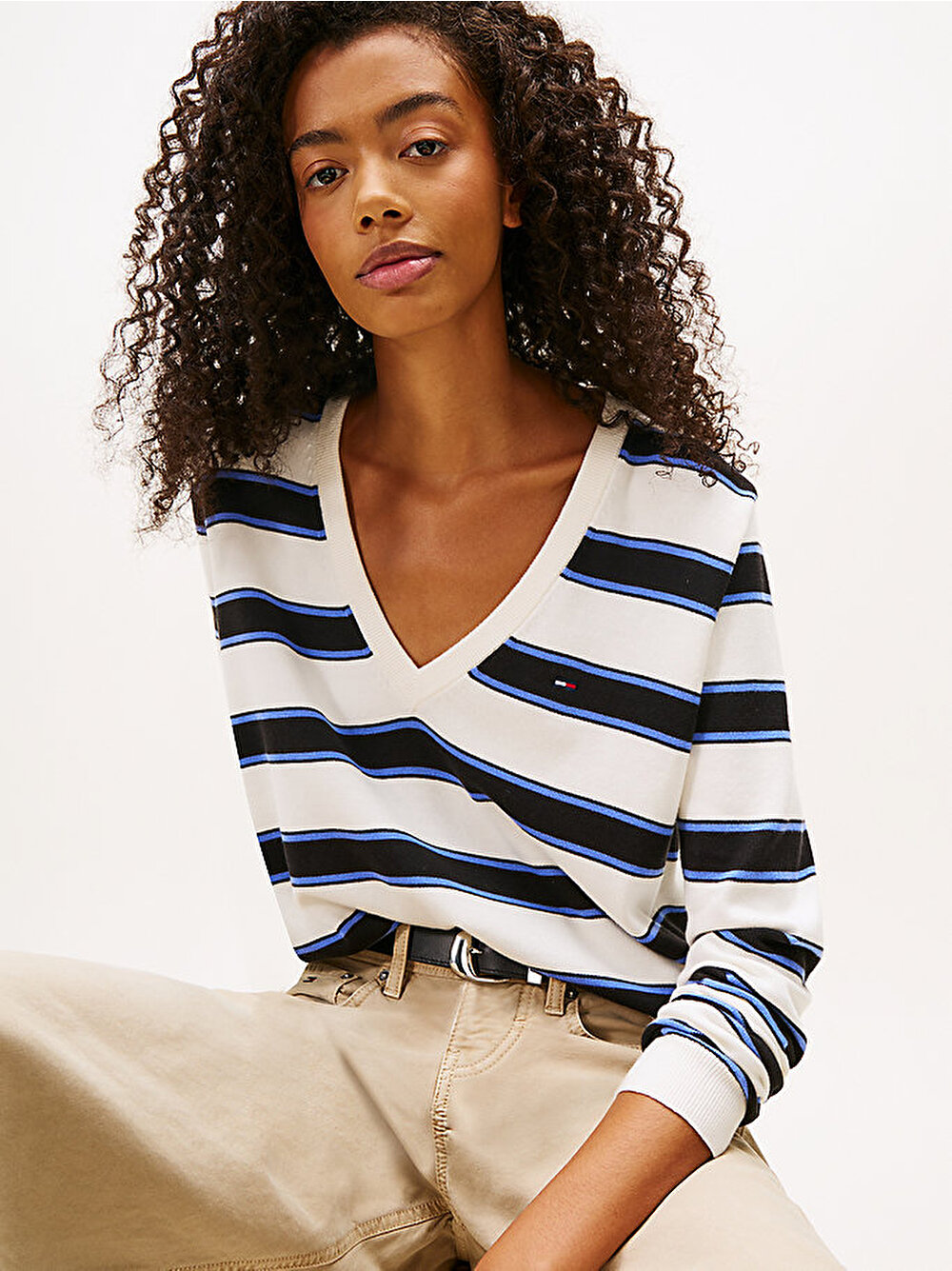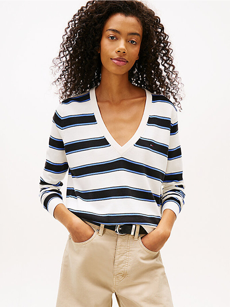 Saf penye pamuktan üretilen ve derin V yaka detayına sahip bu zamansız kazakla gardırobunuza akıllı bir kolej stili katın.