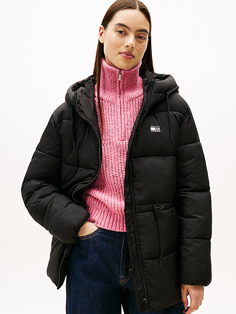 Rahat dolgusu ve koruyucu büzgü ipli kapüşonu ile bu fermuarlı yırtılmaz puffer ceket, kış yürüyüşleri için ideal bir seçim.