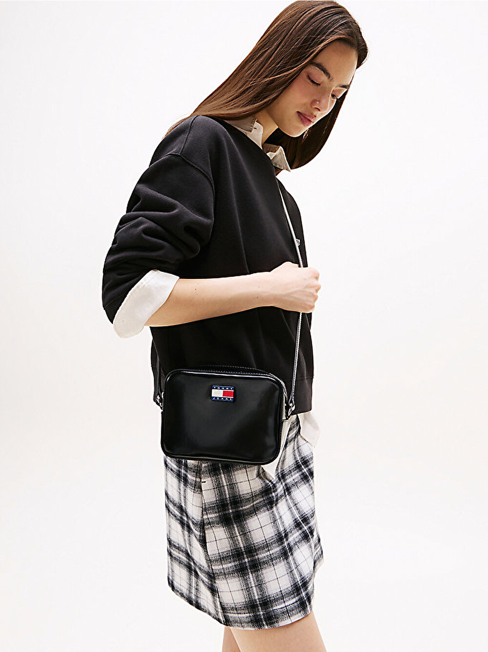 Parlak yüzeyi ve Tommy rozet plakasıyla dikkat çeken bu çapraz kamera çanta, günlük görünümlerinize enerji katıyor.