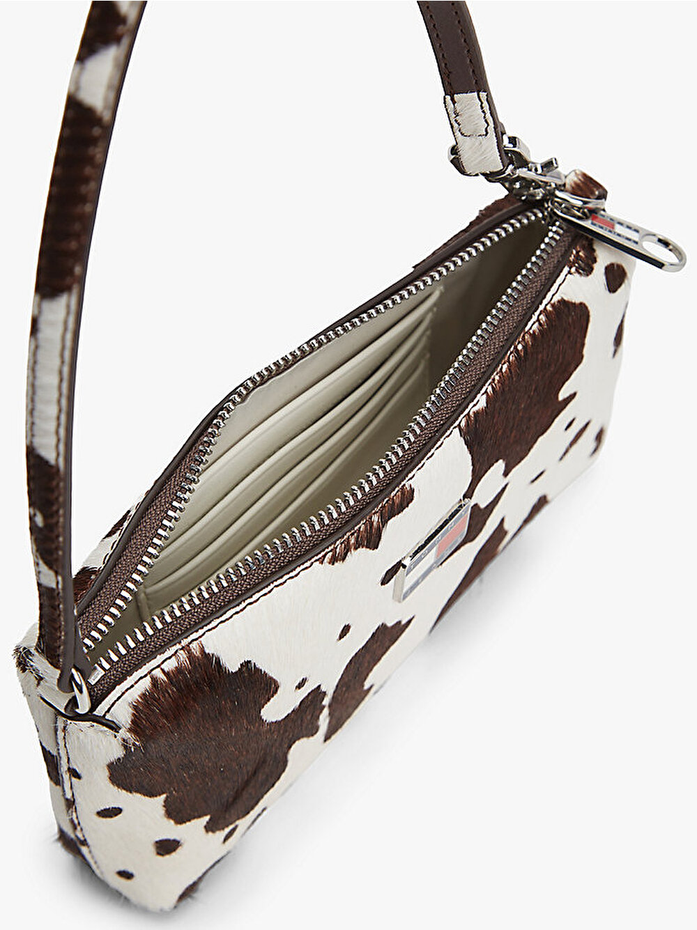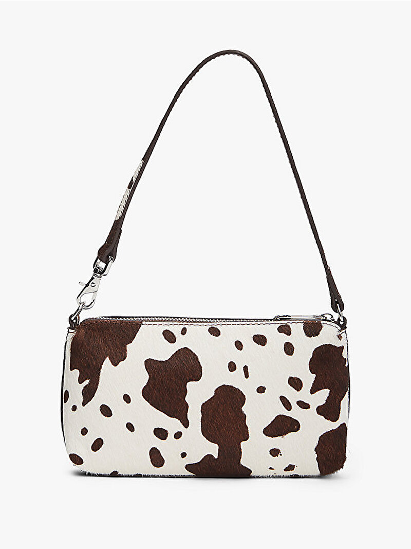 Bu dana tüyü cüzdan, dikkat çekici bir inek deseni sunarken hareketli askısı sayesinde omuzda veya bilekte taşınabilir.
