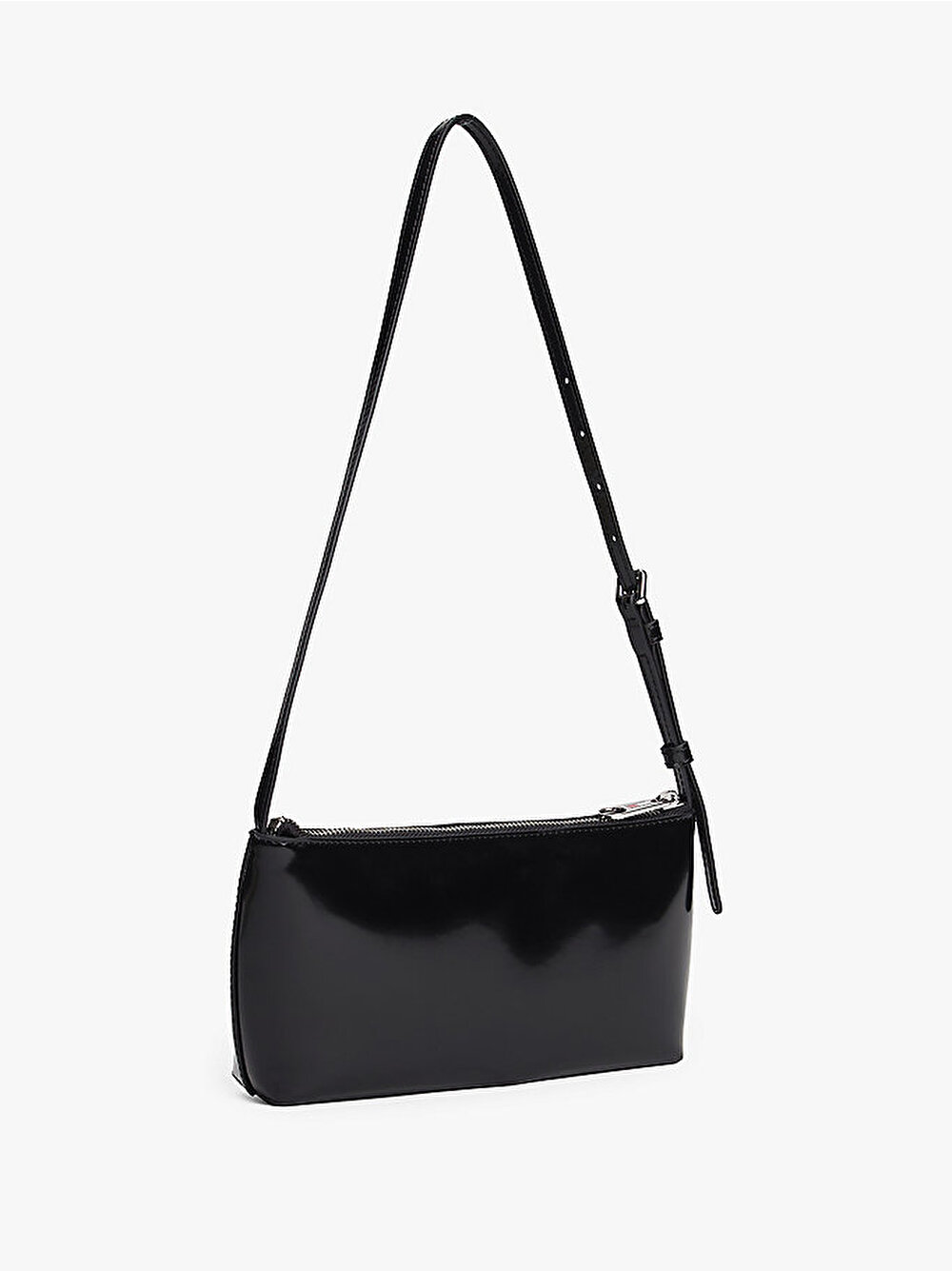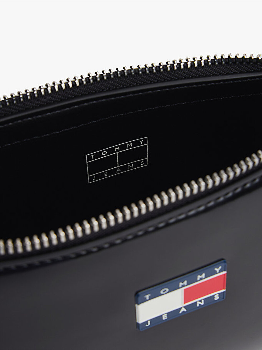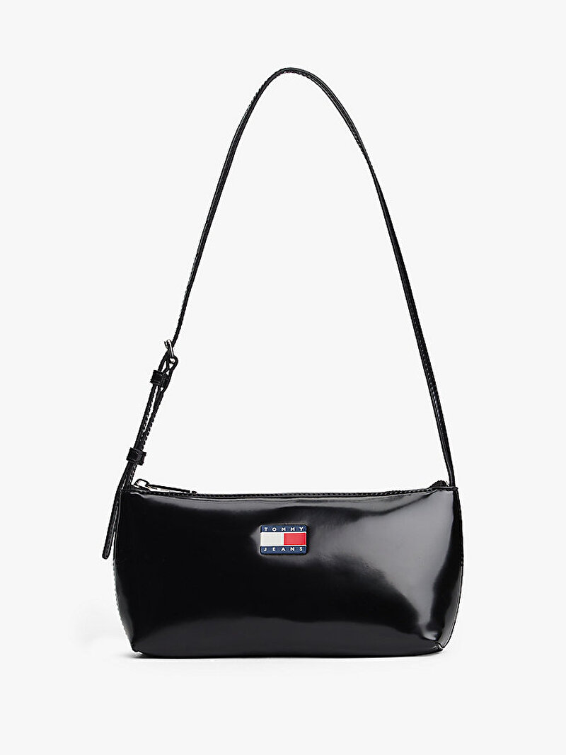 Önünde göze çarpan bir Tommy rozetli plaka bulunan bu parlak omuz çantasıyla kıyafetlerinize retro bir hava katın.