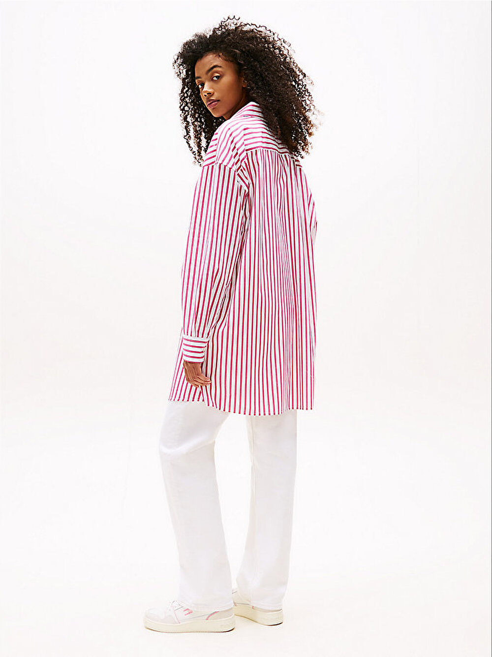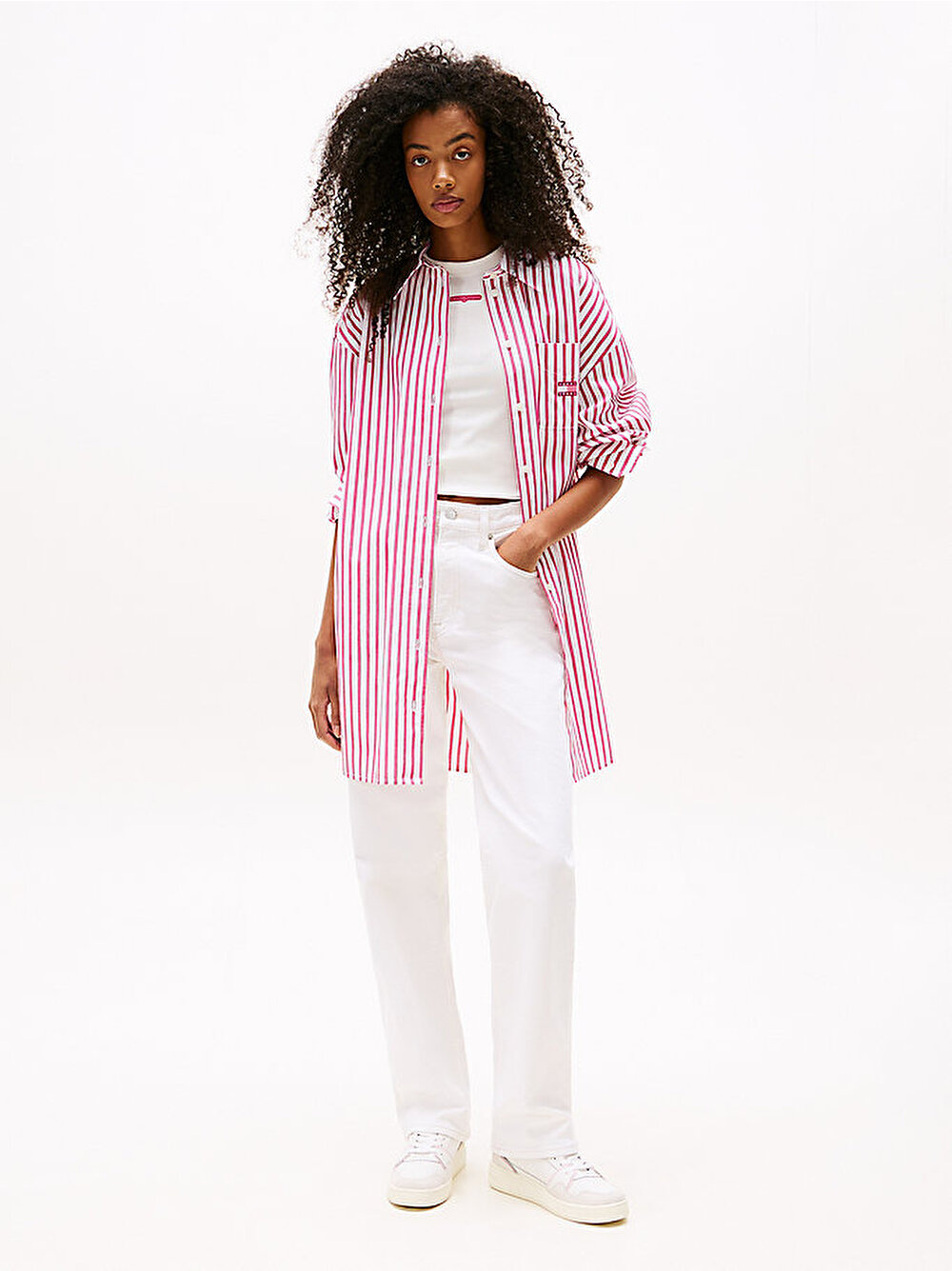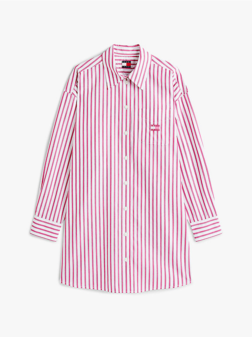 Cep kısmındaki rozet detayıyla dikkat çeken bu oversize gömlek elbise, güneşli günler için mükemmel bir imza stili sunuyor.
