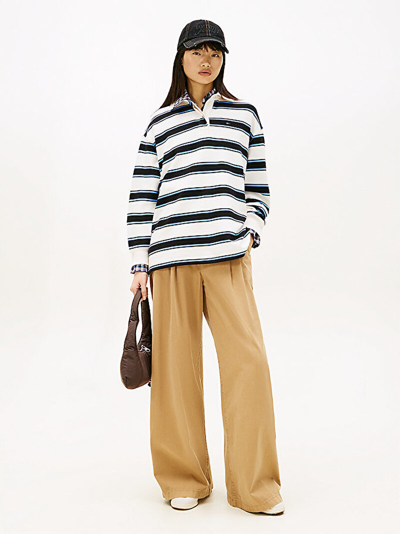 Modern wide-leg siluetine miras esintili bir detay katan ön pilileriyle bu chino pantolon, hem iş günleri hem hafta sonları için çok yönlü bir tercih.