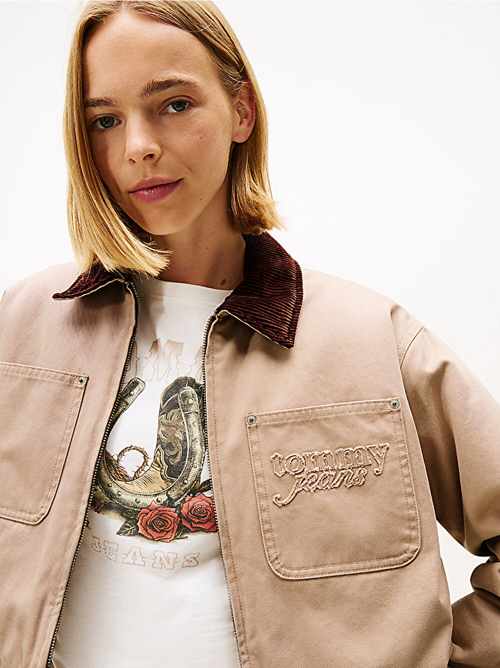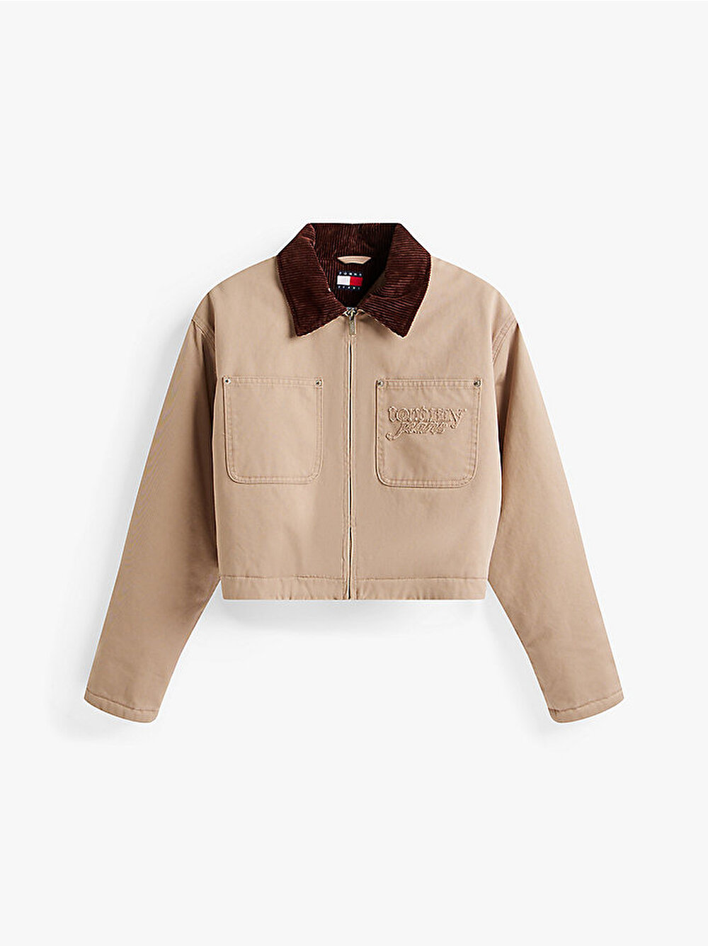 • Göğüs cebinde tonal Tommy Jeans serif yazılı aplike logo