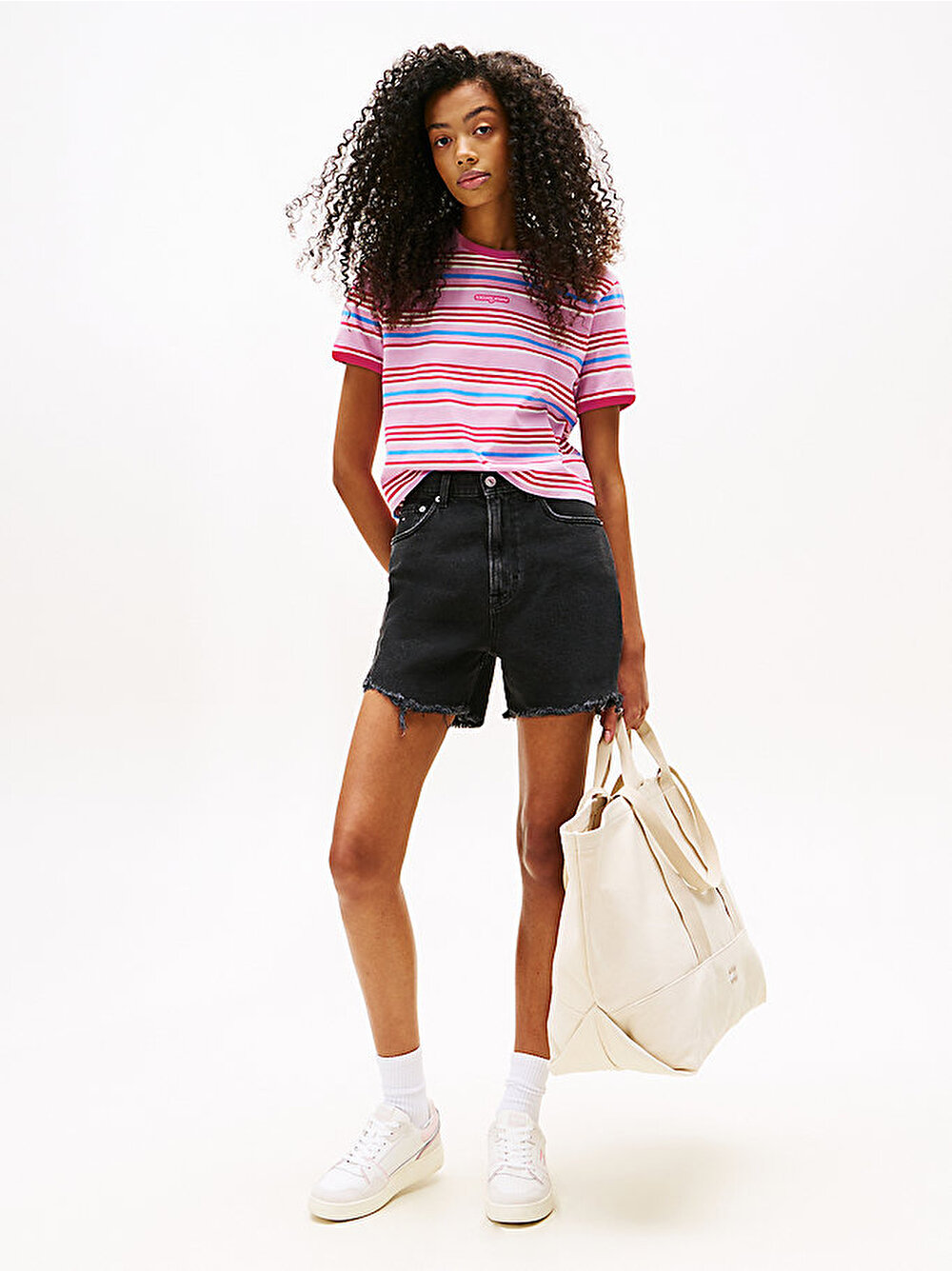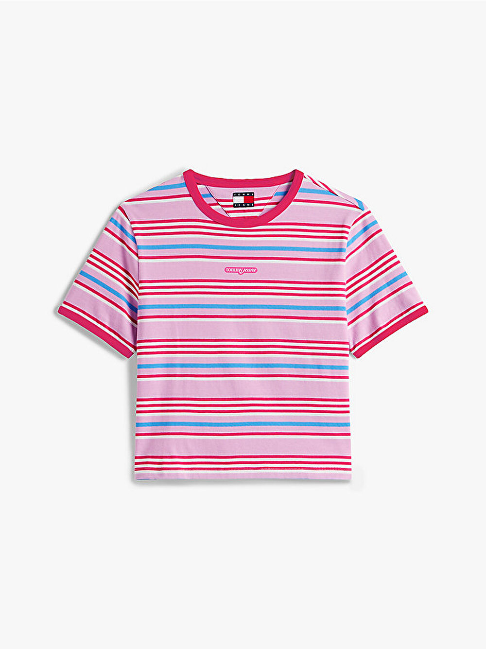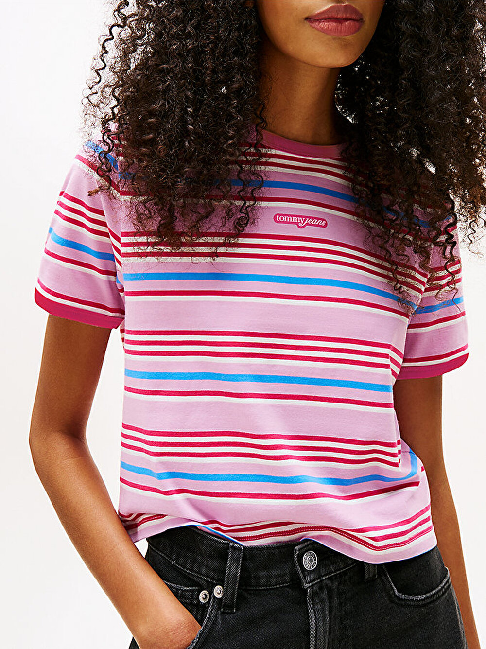 Saf pamuktan üretilen bu tişört, baştan sona çizgili tasarımı ve serif yazı tipiyle hazırlanmış logo etiketiyle fark yaratan yükseltilmiş bir görünüm sunuyor.