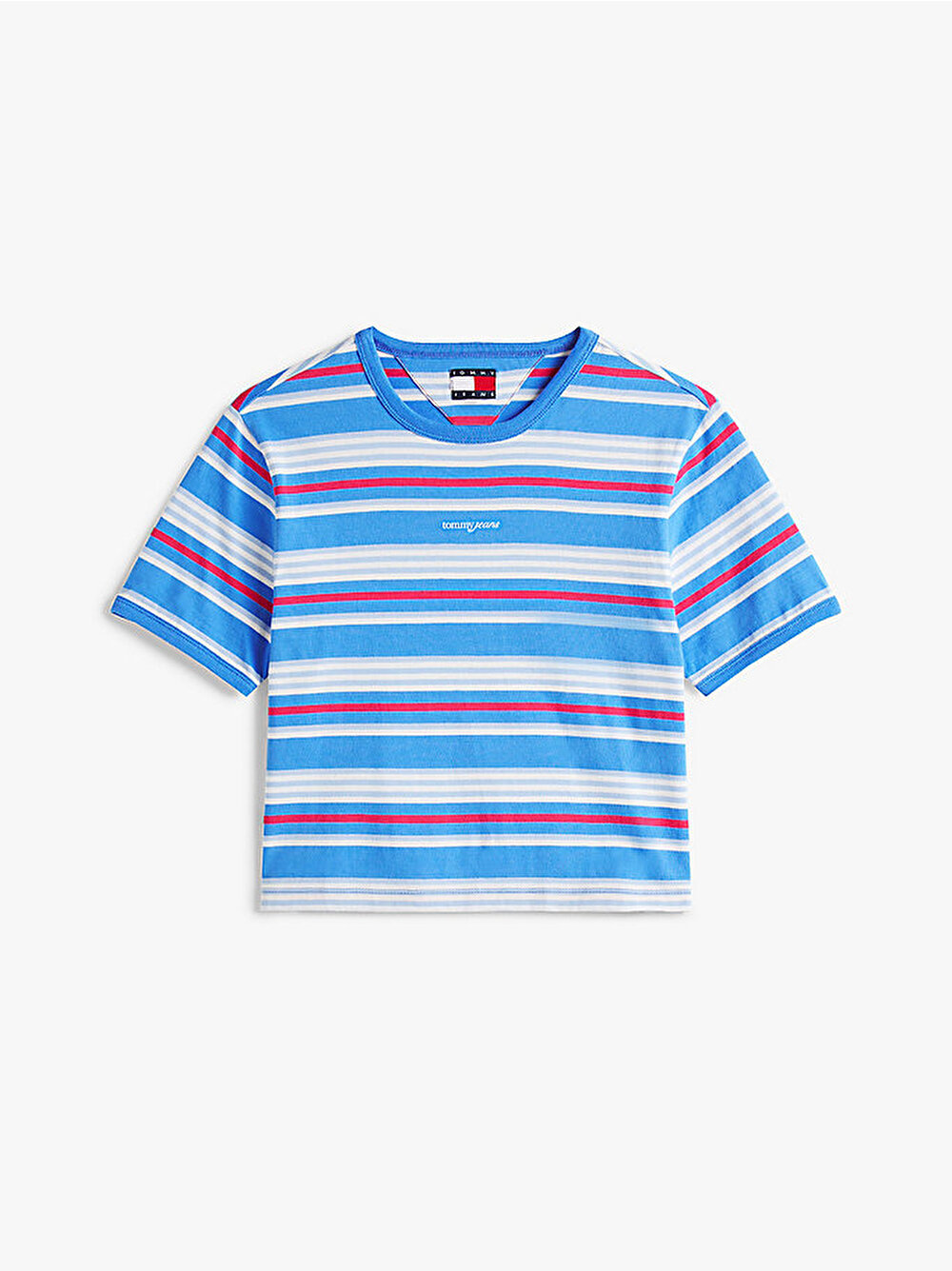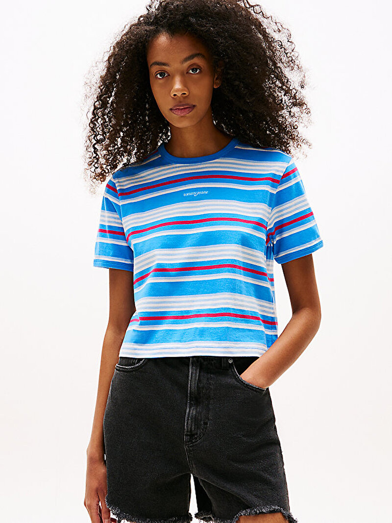 Saf pamuktan üretilen bu tişört, baştan sona çizgili tasarımı ve serif yazı tipiyle hazırlanmış logo etiketiyle fark yaratan yükseltilmiş bir görünüm sunuyor.