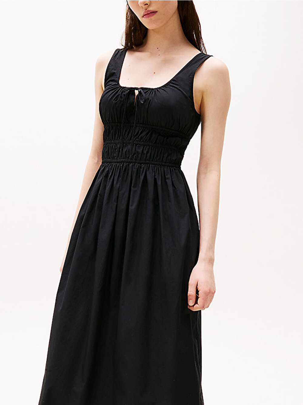 Bu slim fit elbise, pamuk poplin kumaştan üretilmiş olup vücuda oturan büzgülü üst kısmı ve hafif dökümlü midi boy eteğiyle feminen bir silüet sunar.