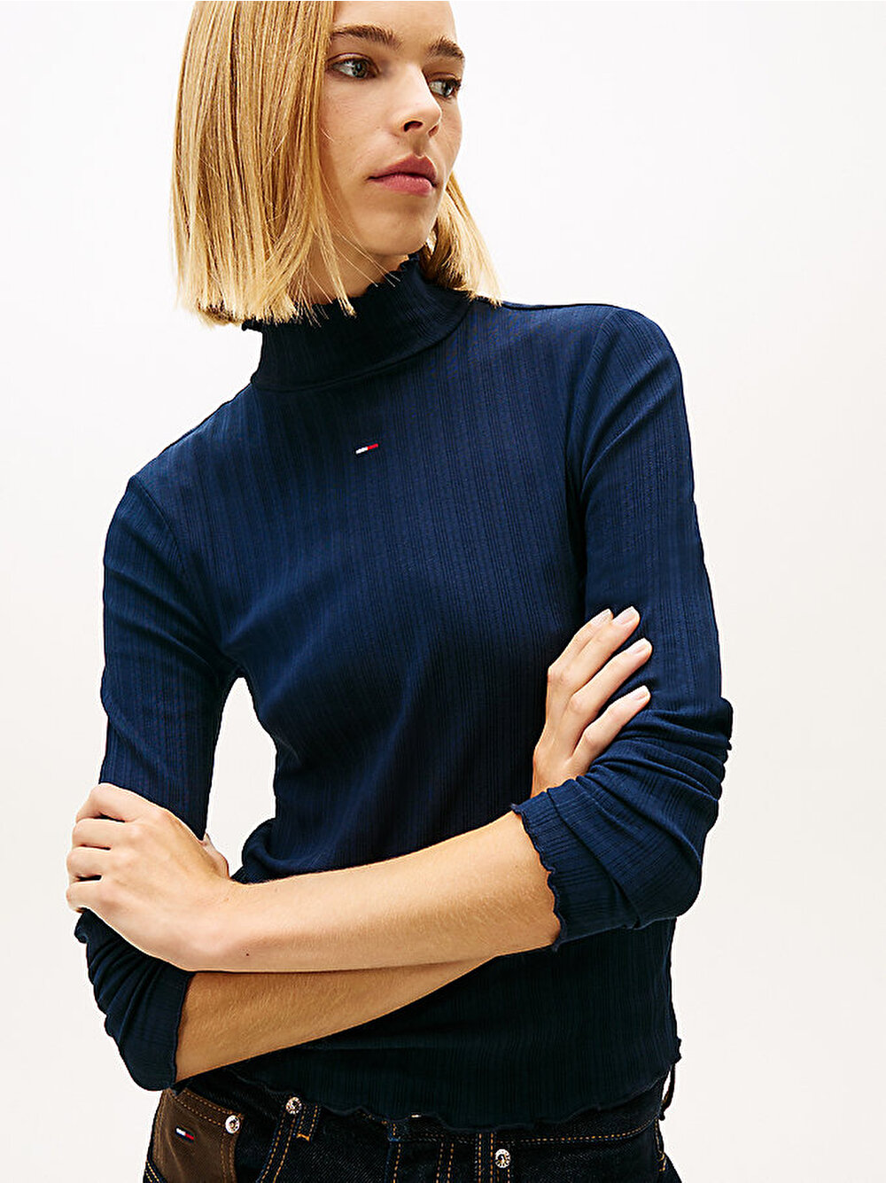 Oyunbaz fırfır detaylarıyla öne çıkan bu slim fit üst, nervürlü kumaş üzerinde uzanan premium pointelle jakarlı deseniyle dikkat çekiyor.