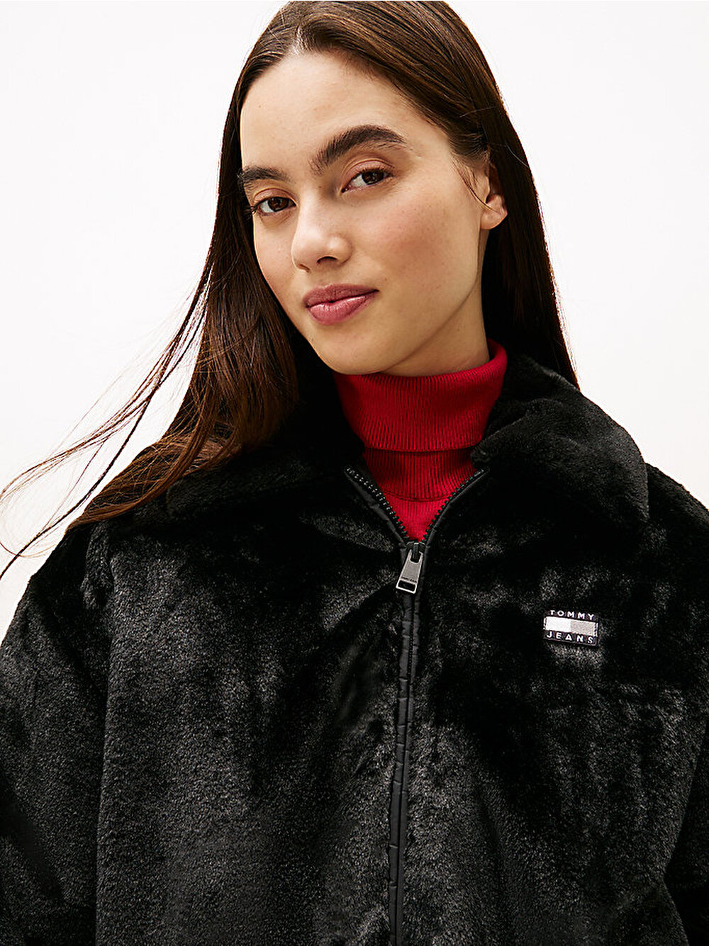 Kolayca katmanlama için rahat bir kesimle tasarlanan bu suni kürklü bomber ceket ile günlük kıyafetlerinize iddialı bir hava katın.
