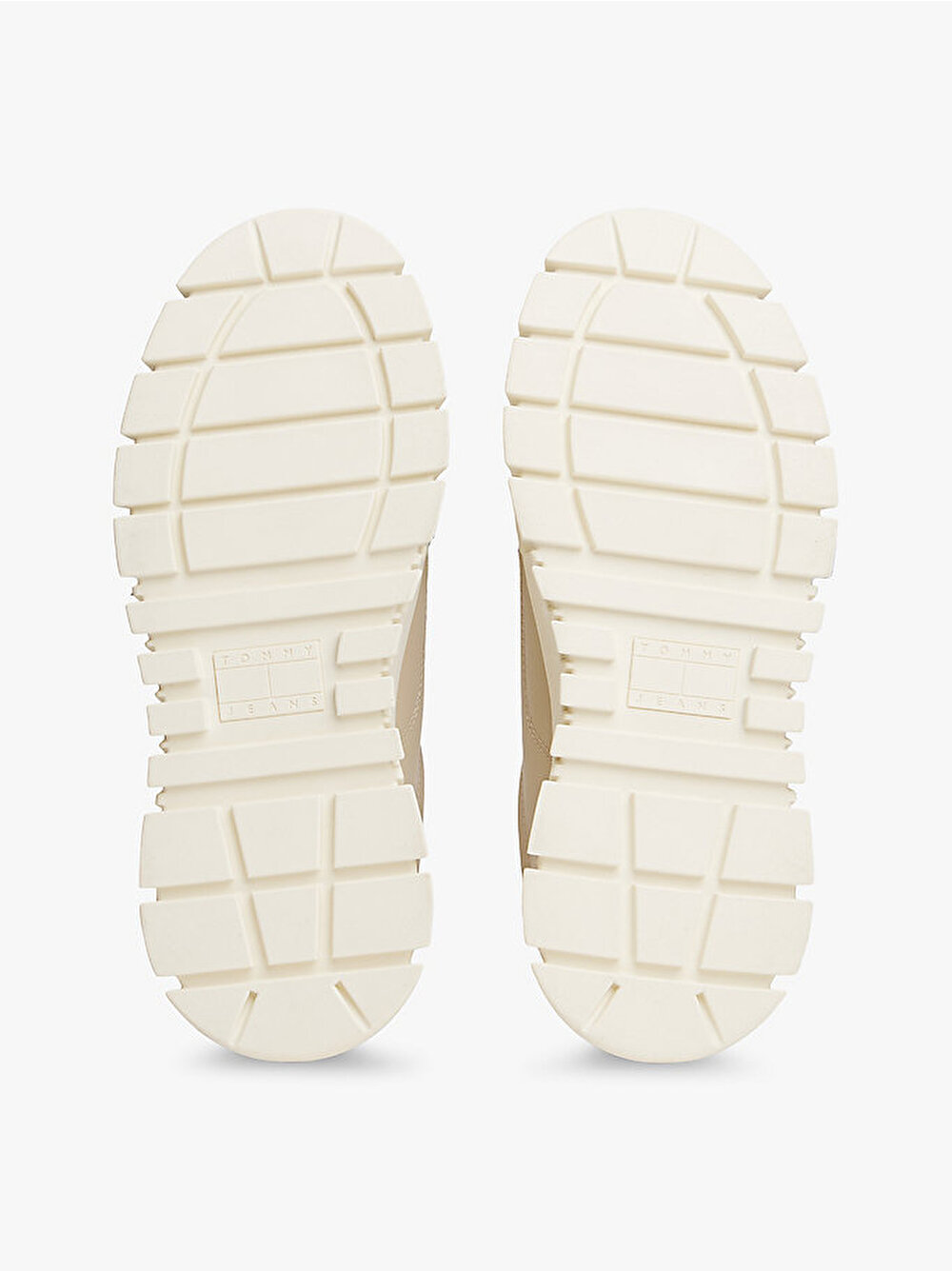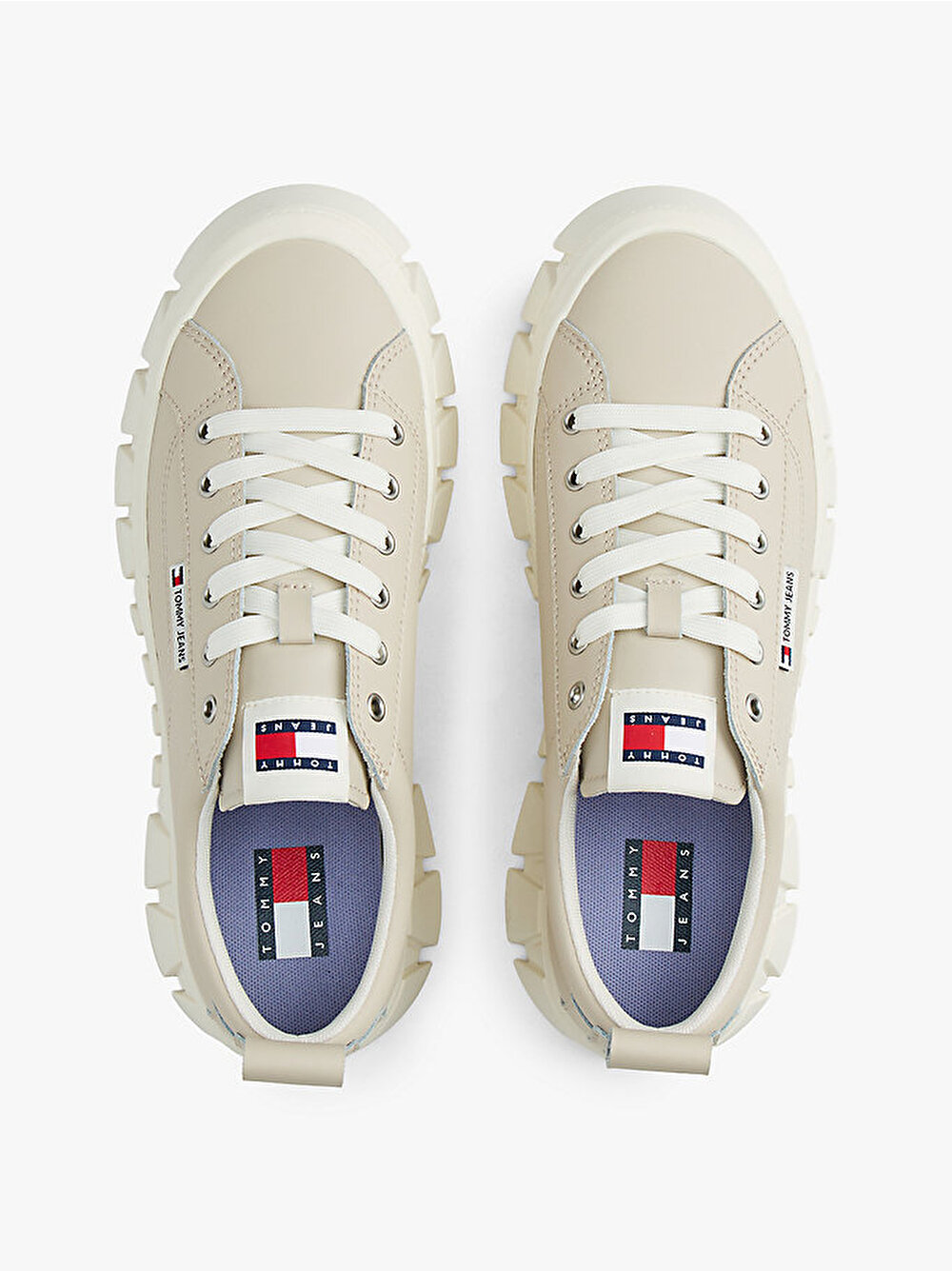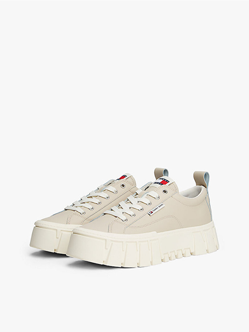 Pürüzsüz kaplamalı deriden üretilen bu platform trainers spor ayakkabı, alçak profilli bir siluete sahip olup tırtıklı dış tabanlarıyla retro bir dokunuş kazanıyor.