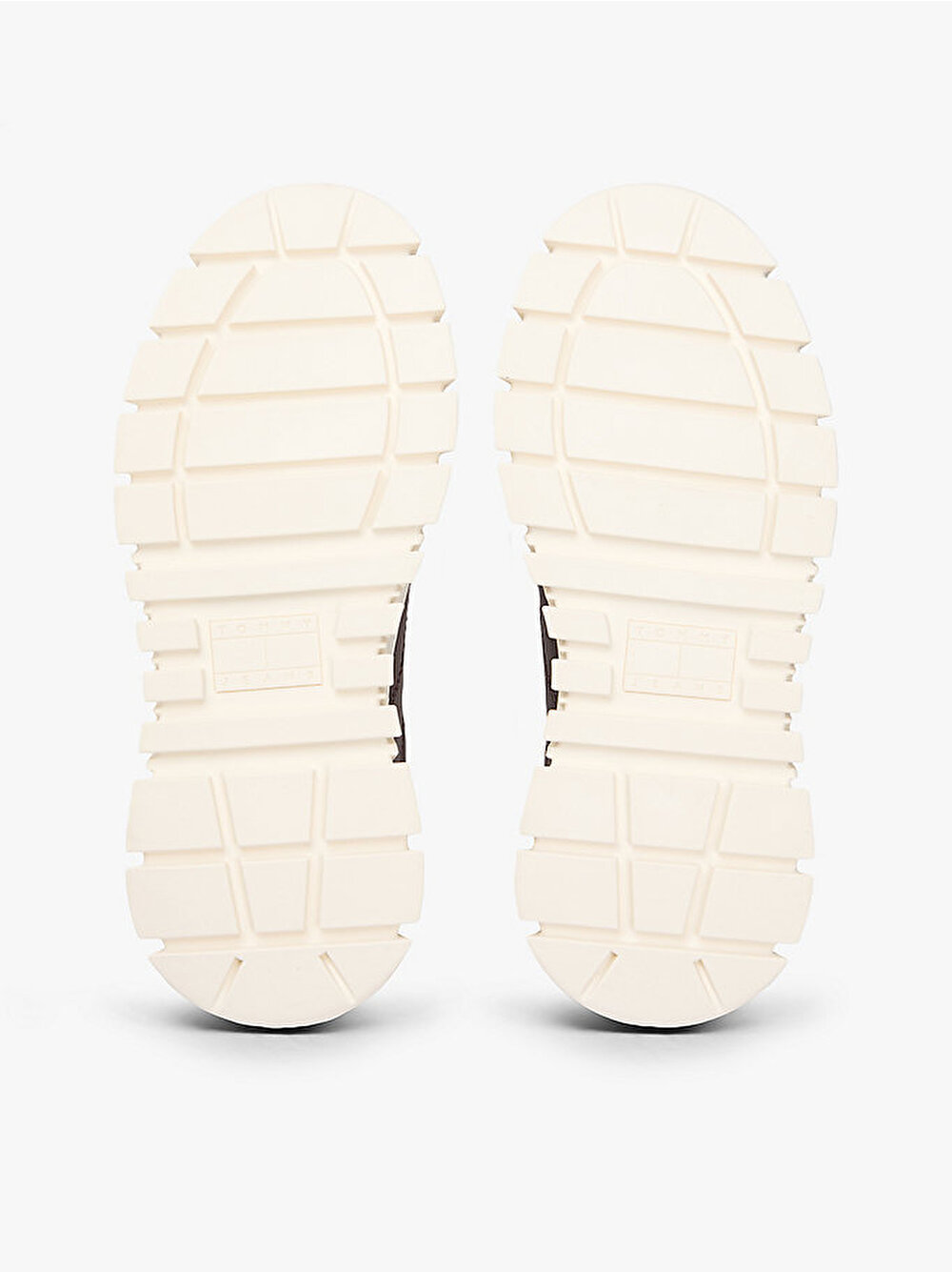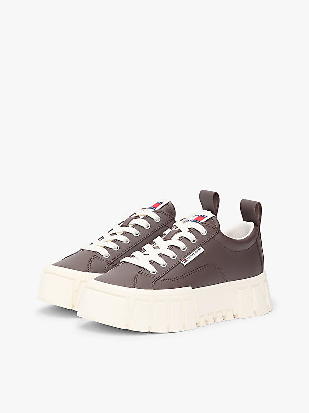 Pürüzsüz kaplamalı deriden üretilen bu platform trainers spor ayakkabı, alçak profilli bir siluete sahip olup tırtıklı dış tabanlarıyla retro bir dokunuş kazanıyor.