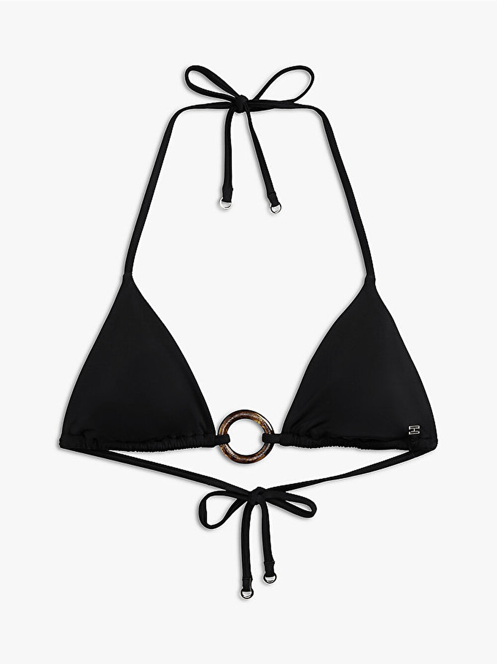 - Suni kaplumbağa kabuğu desenli halkadan, metal detaylara kadar lüks dokunuşlar, bu üçgen bikini üstüne rafine bir zarafet katıyor.
