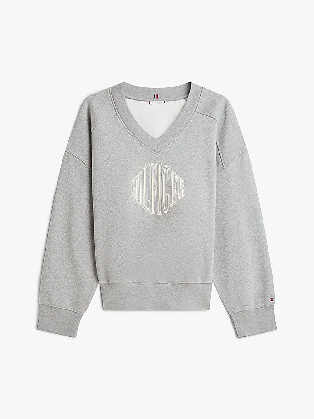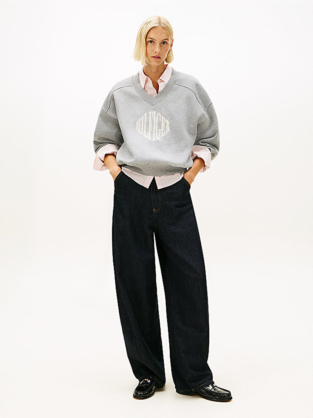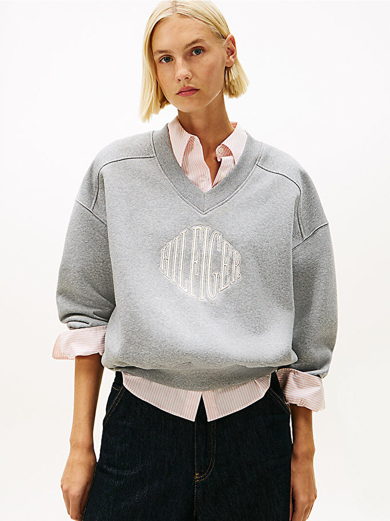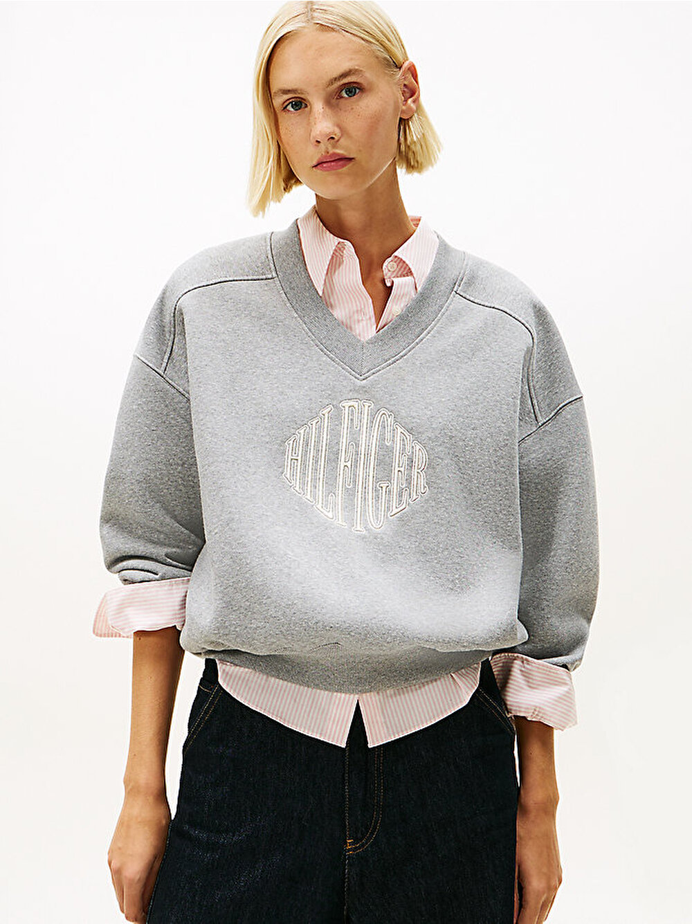 Rahat siluetini güçlendiren pamuk karışımlı polar kumaşı, vücuda oturan V yakası ve varsity tarzı logo nakışıyla bu sweatshirt ile sarmalanın.