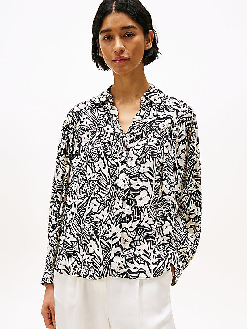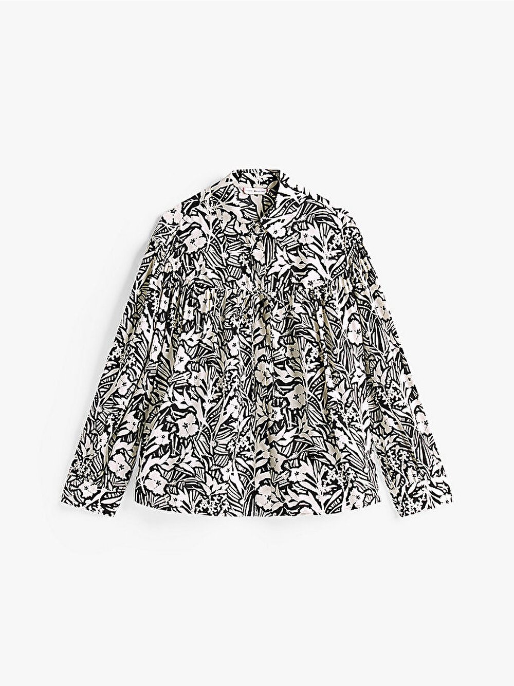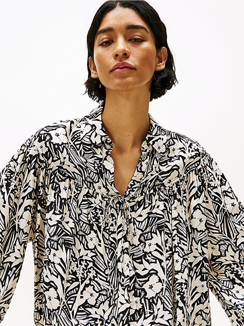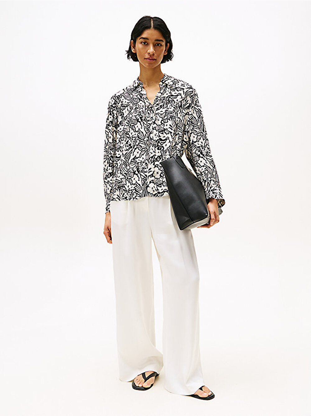 Birinci sınıf bir görünüm için gizli bayrak detaylarına sahip viskon jakarla dokunan bu rahat kesim bluz, gündüzden geceye stil için harika bir seçenektir.