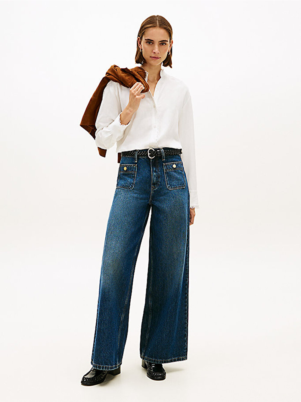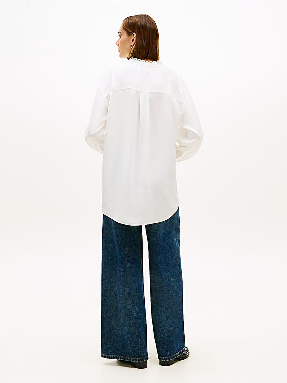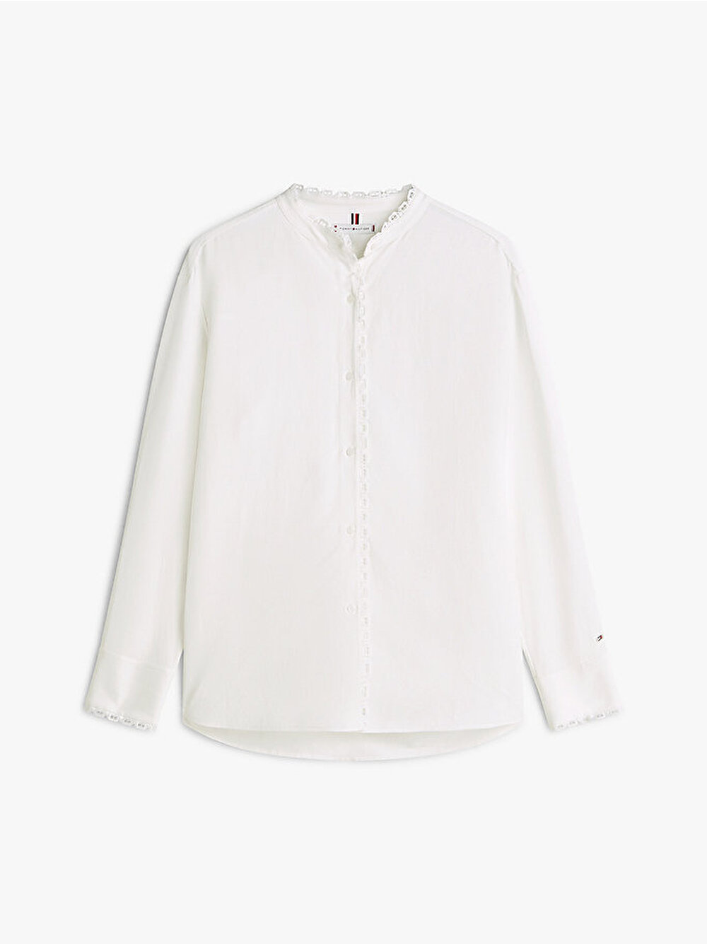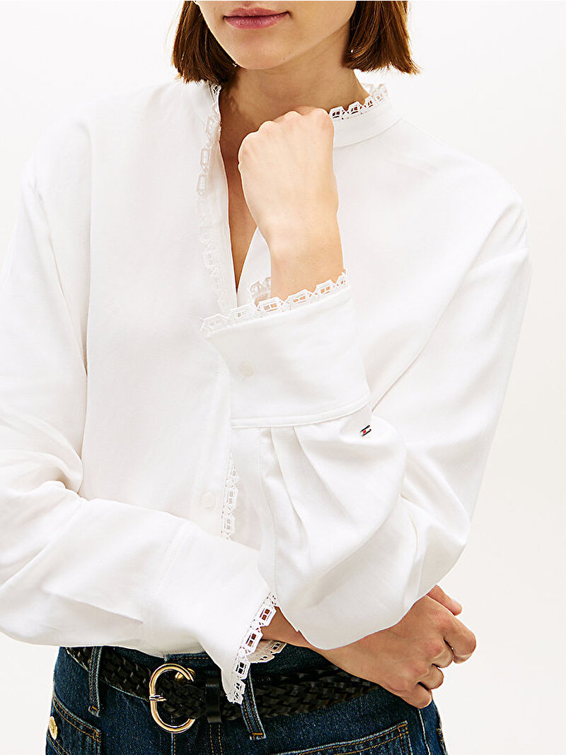 Bu oversize gömlek, bayrak desenli dantel süslemeleriyle romantik stili yansıtıyor ve narin mandarin yakası ve manşetleri daha da öne çıkarıyor.