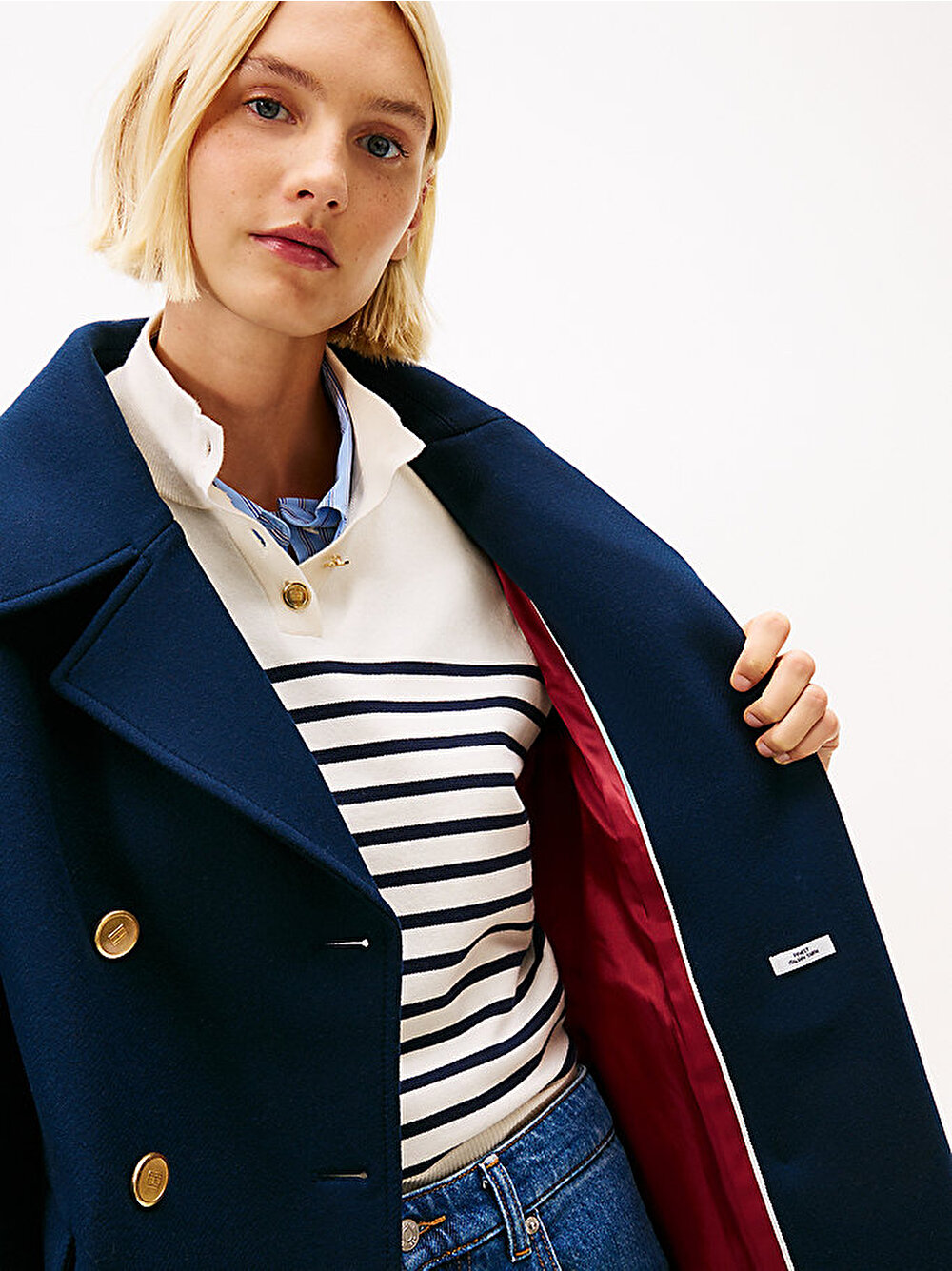 Soğuk günlerde kaşmirle zenginleştirilmiş lüks yün karışımıyla üretilmiş bu şık kruvaze peacoat kaban ile modern bir klasik miras görünümü yakalayın.