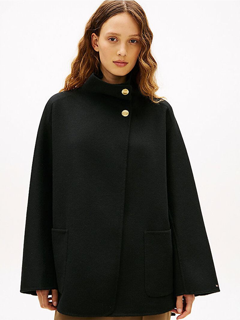 Bu sıcak yün karışımlı kaban, rahat funnel yakası ve şık altın tonlu düğmeleriyle soğuk aylar için sofistike bir tercihtir.