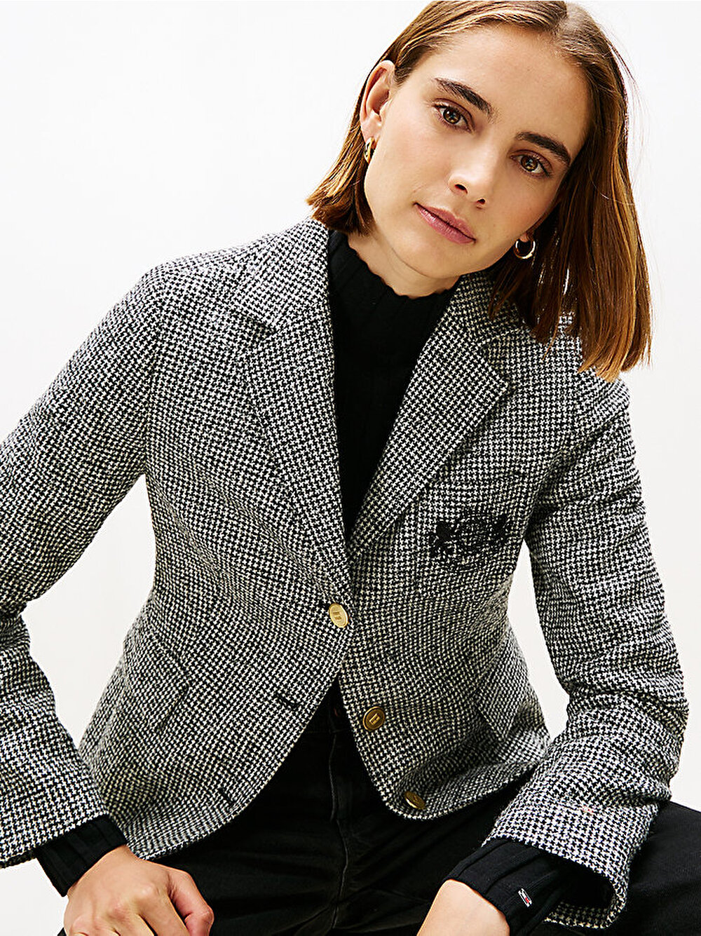 Bu tek düğmeli blazer, tüm yüzeyini kaplayan mikro balıksırtı desen ve TH arma nakış süslemesi ile vurgulanmış slim-fit bir tasarıma sahiptir.