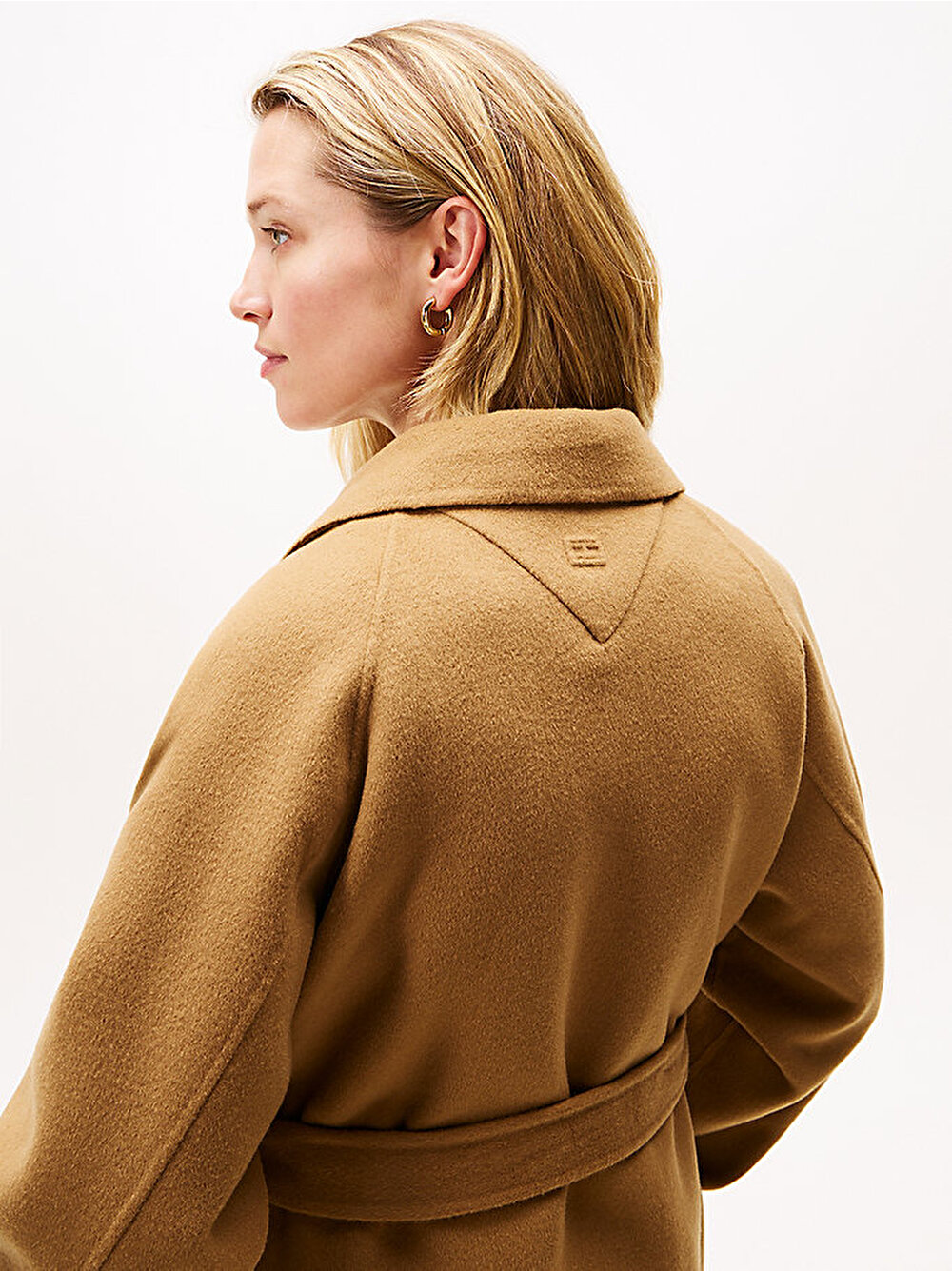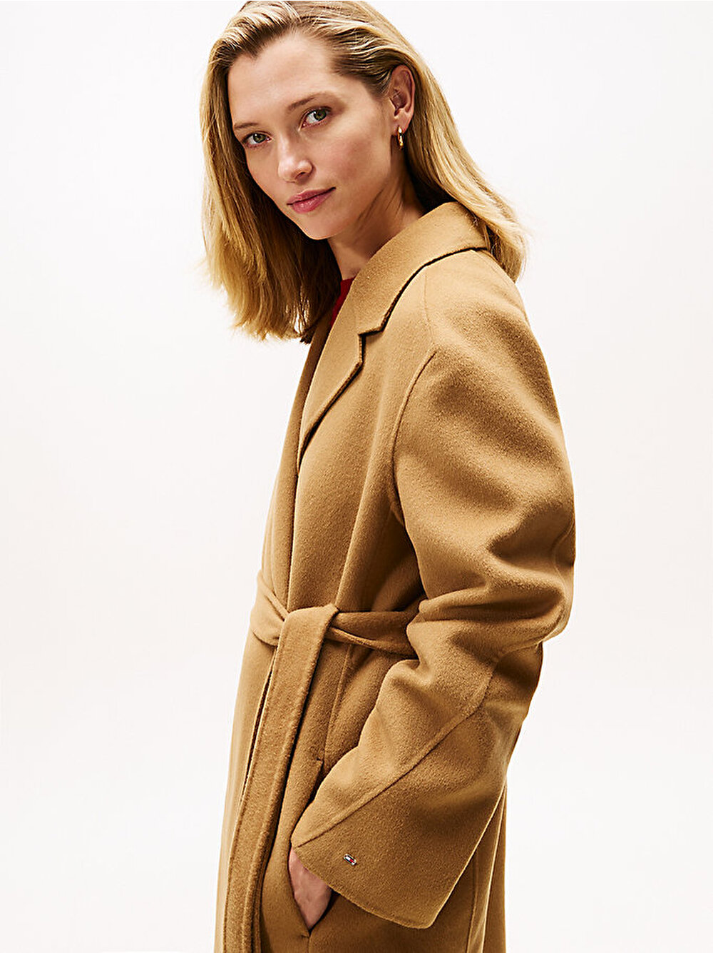 Birinci sınıf bir his için kalın çift yüzlü yün karışımlı kumaştan üretilen bu şık kemerli uzun kesimli palto ile zamansız bir tarzla sarının.