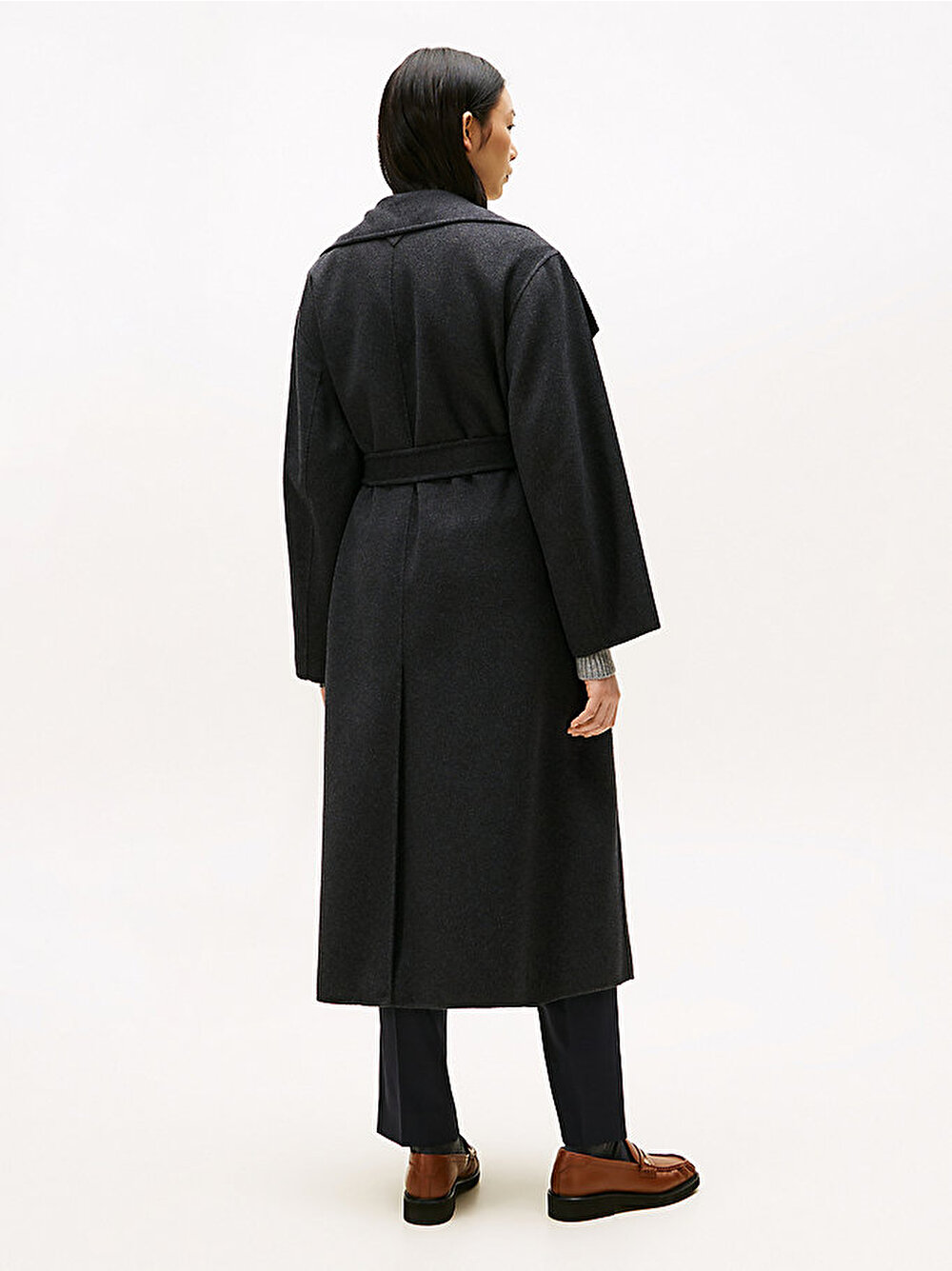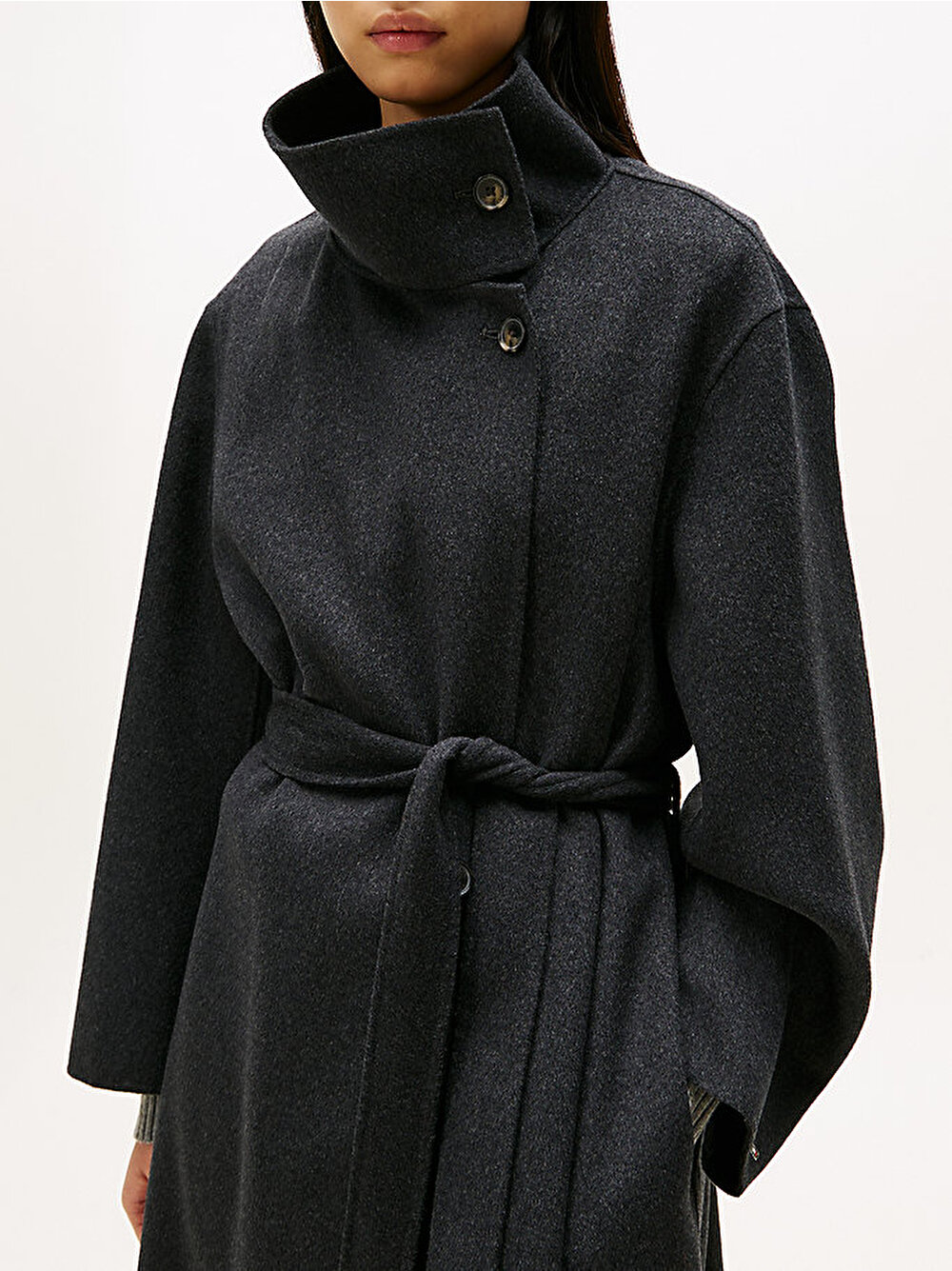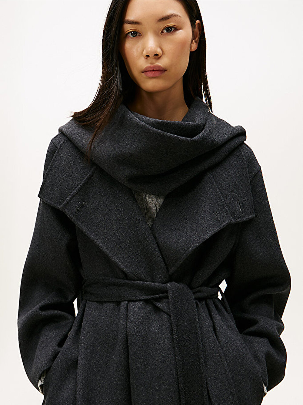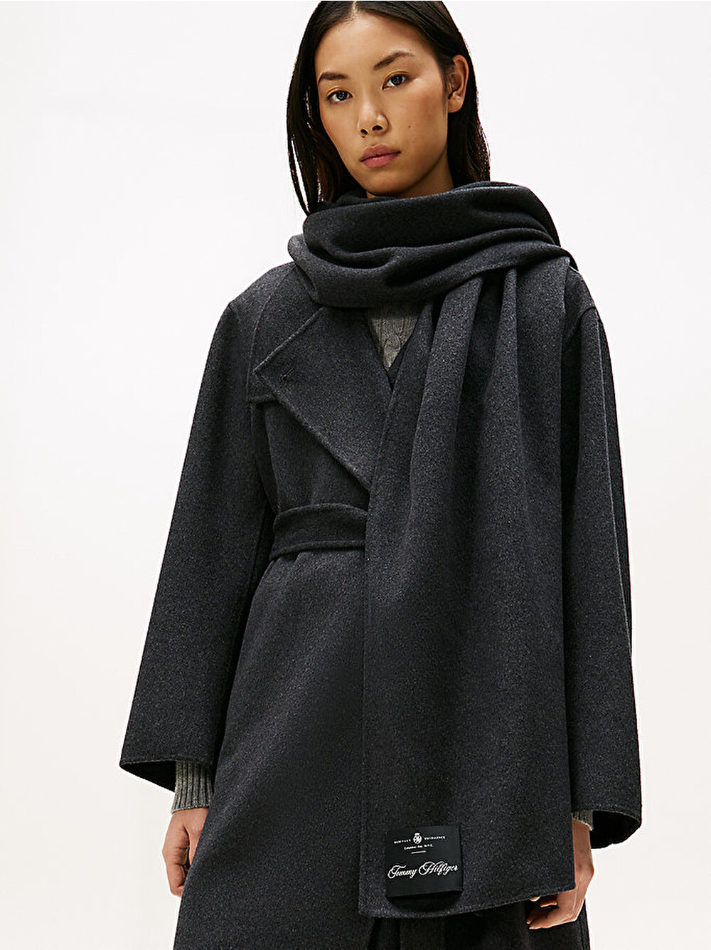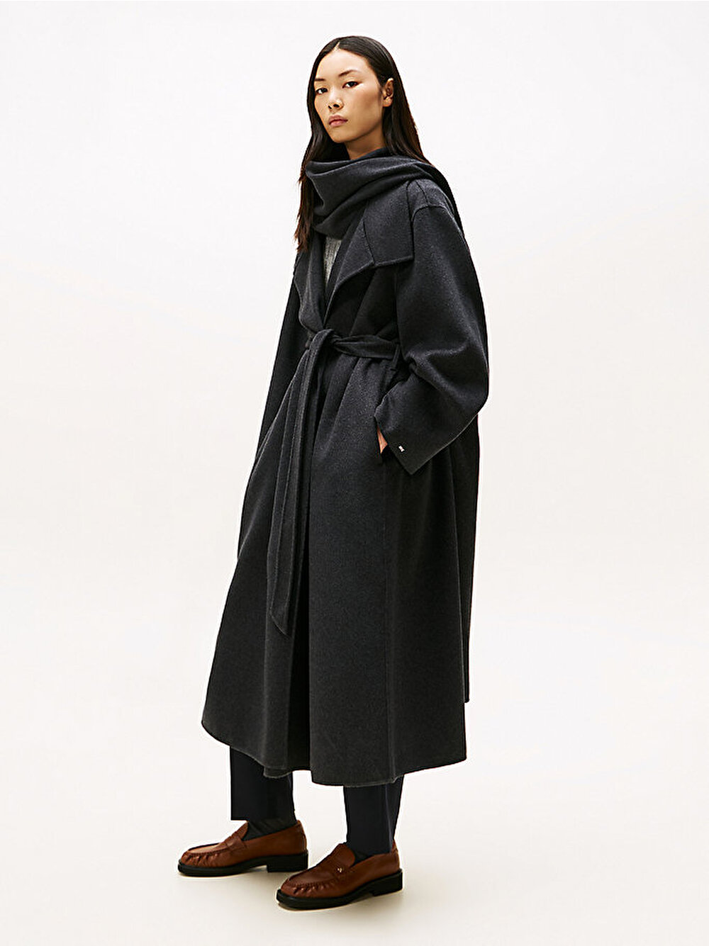 Bu şık uzun kesimli kaban, birinci sınıf çift yüzlü yünden, kemerli bir bel ve uyumlu bir atkı ile çağdaş bir oversize siluette üretilmiştir.