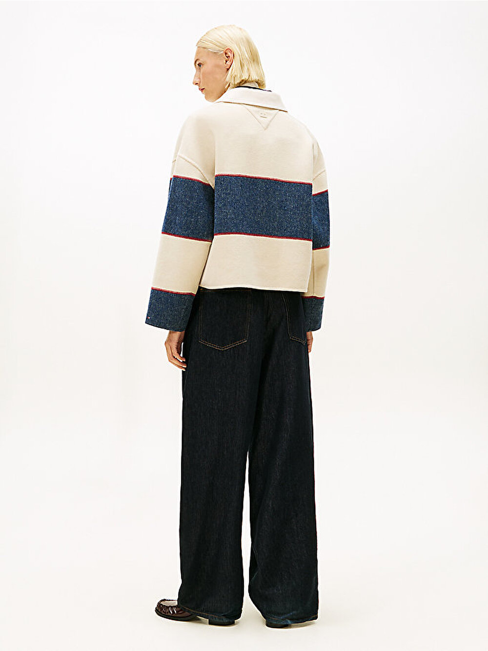Rugby şerit desenli, oversize ve crop kesimli bu çift yüzlü yün karışımlı ceketle kıyafetlerinize preppy bir dokunuş katın.