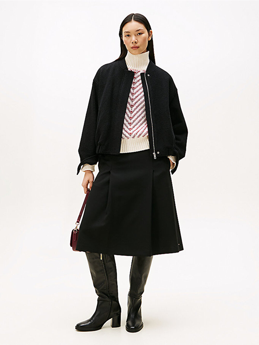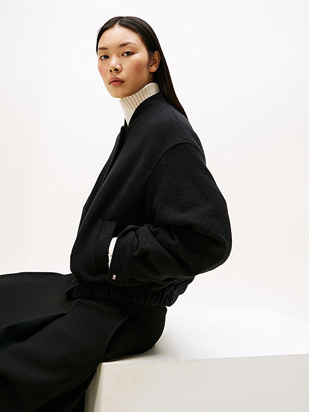 Dokunsal bir his ve üstün bir dokunuş için sıcak, dokulu yün karışımından yapılmış bu şık bomber ceketle katmanlı giyim sezonunu kucaklayın.