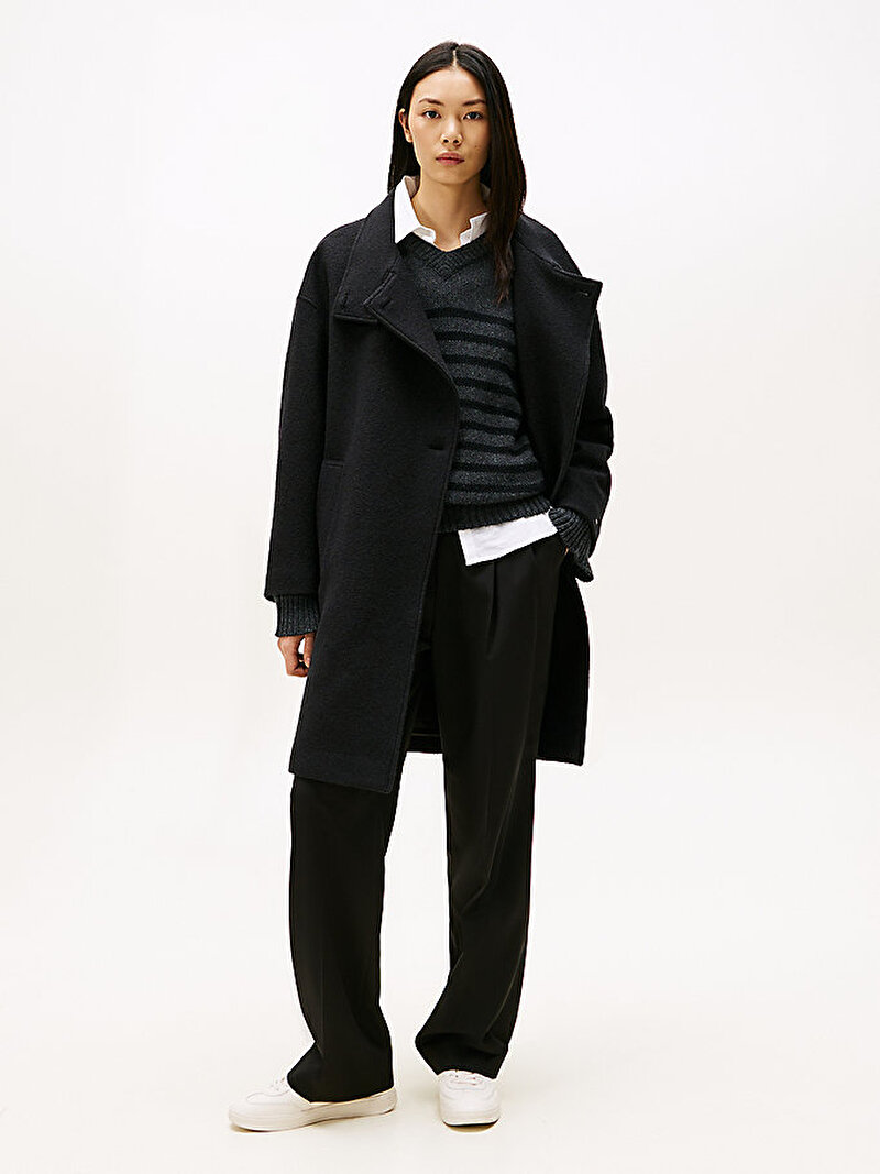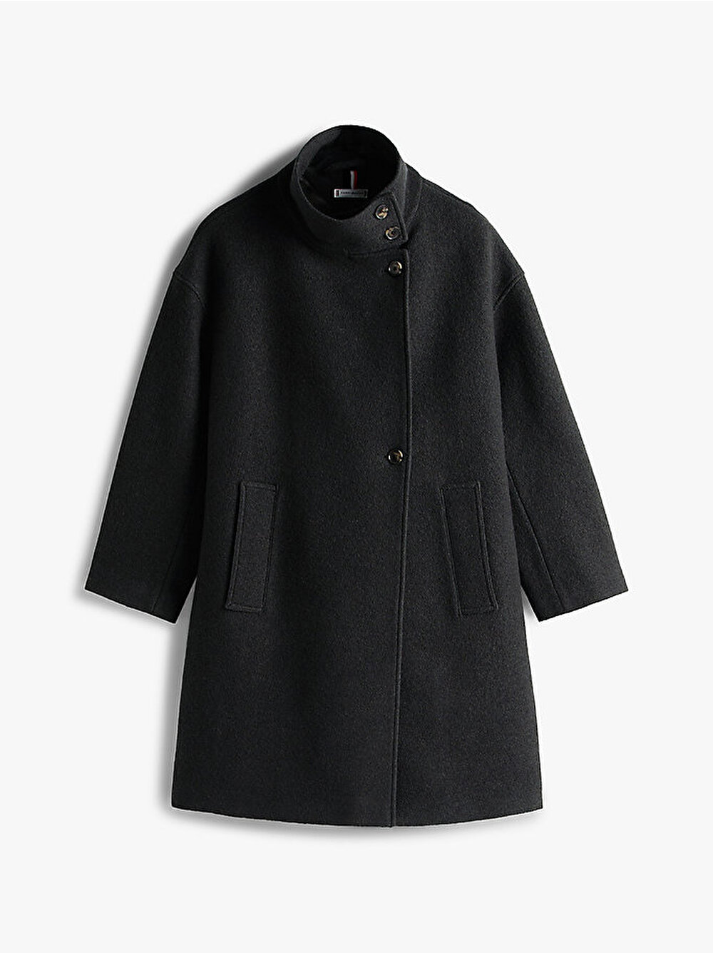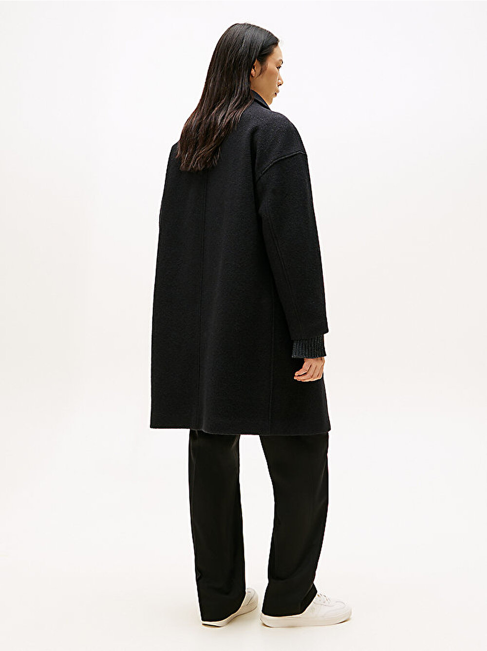 Bu yüksek yakalı kaban, modern ve rahat siluetine lüks ve rahat bir doku katan kaynatılmış, çift yüzlü yün karışımından üretilmiştir.