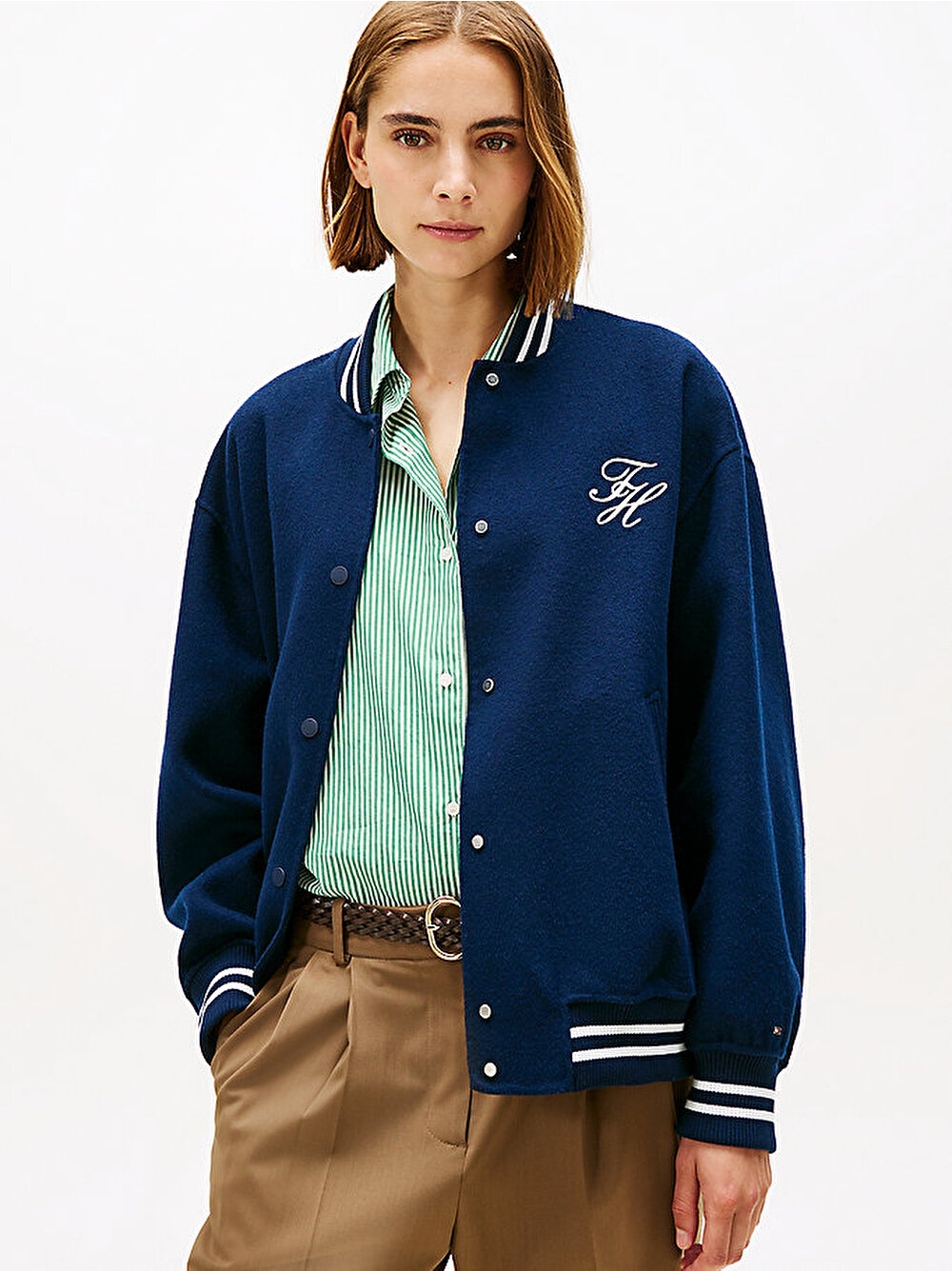 Çizgili ribana örgü kenarları ve sade göğüs logosu ile bu çift yüzlü yün karışımlı bomber ceket, otantik bir üniversite havasına sahip.