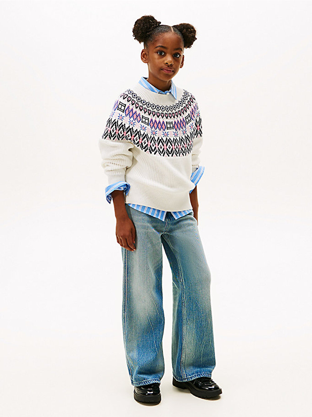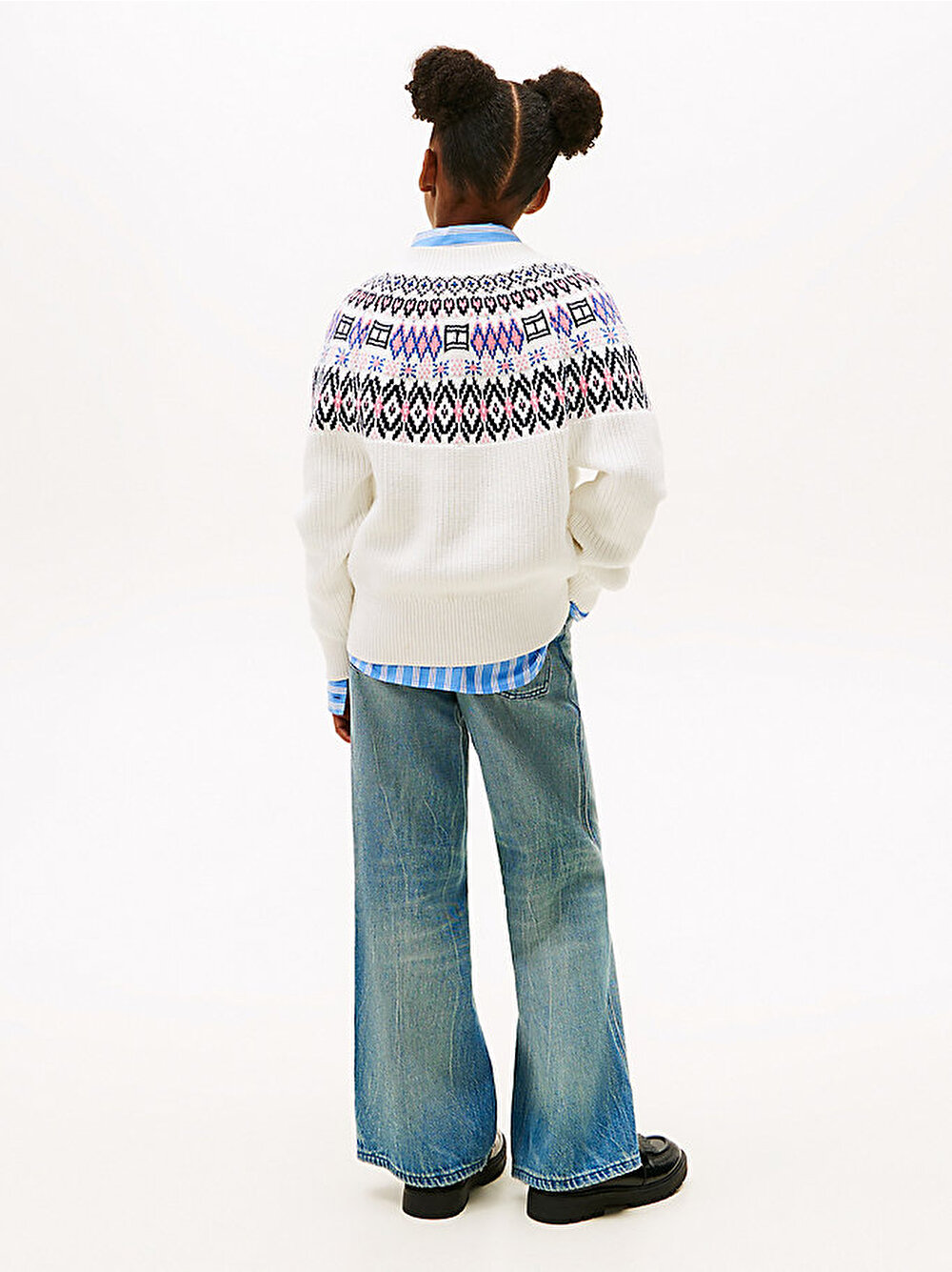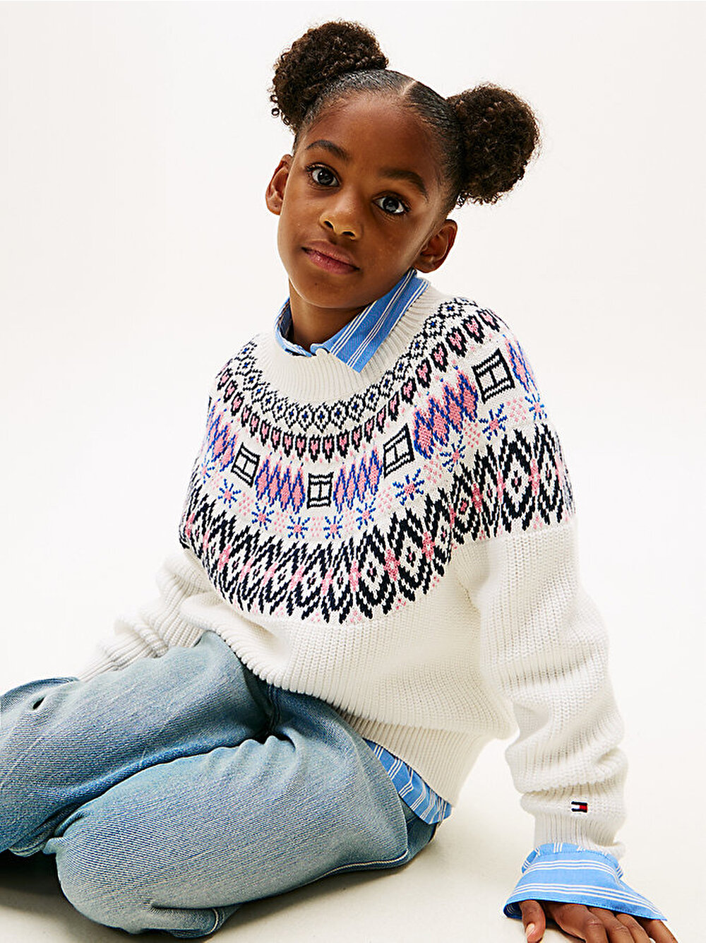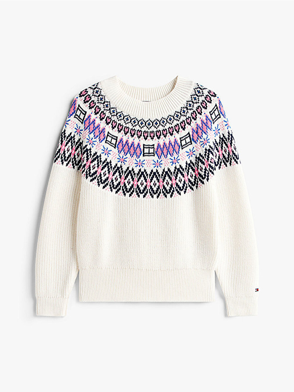 Klasik Fair Isle desenine sahip bu saf penye kazak, mevsimlik partiler veya yumuşacık akşamlar için mükemmel bir seçimdir.