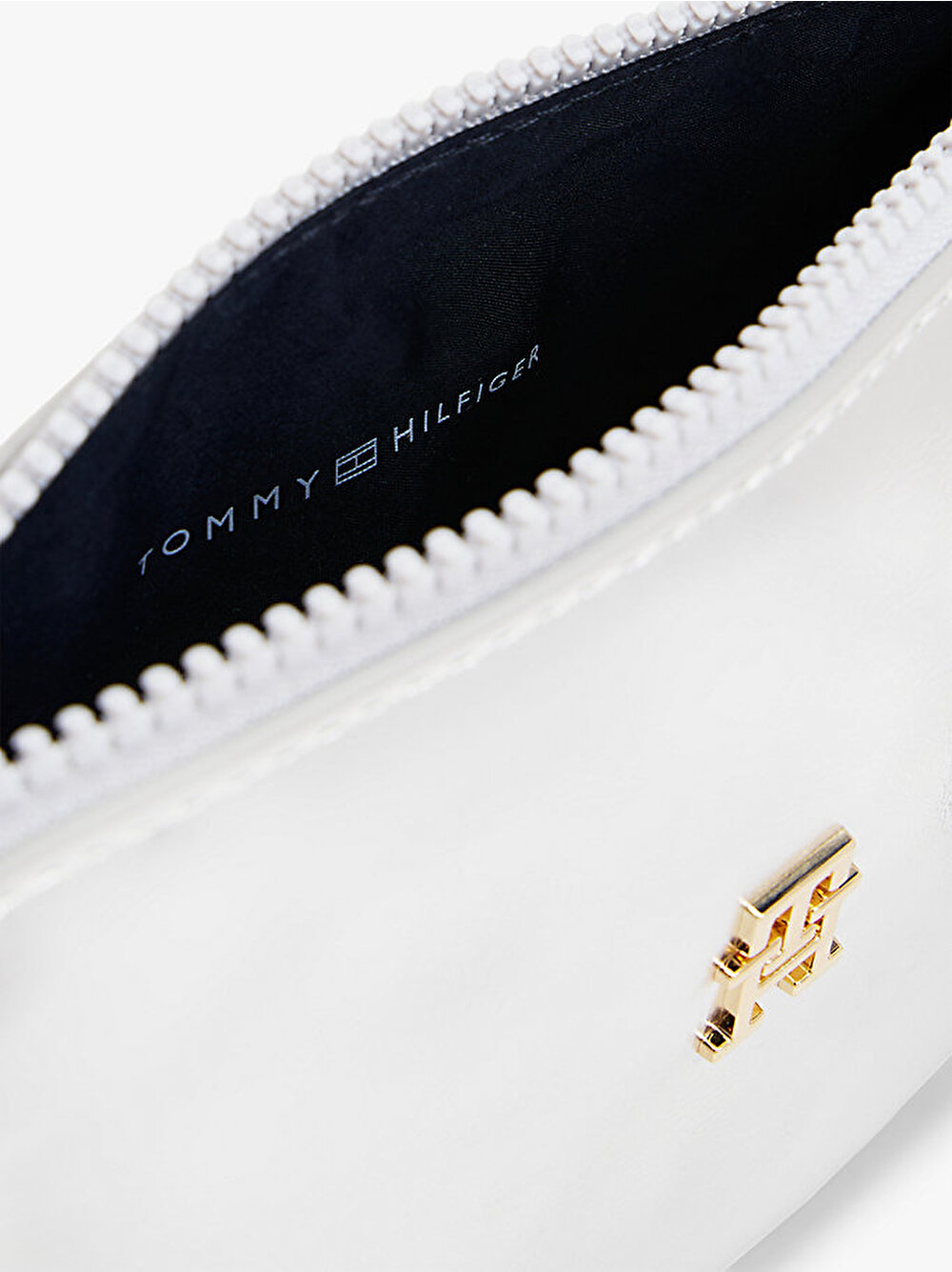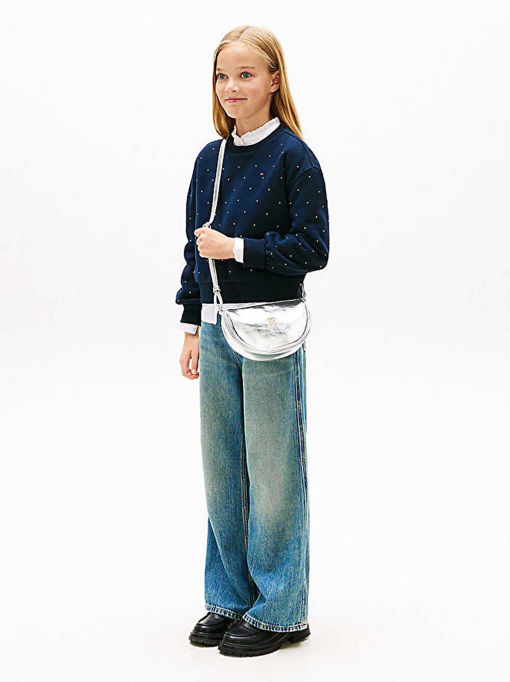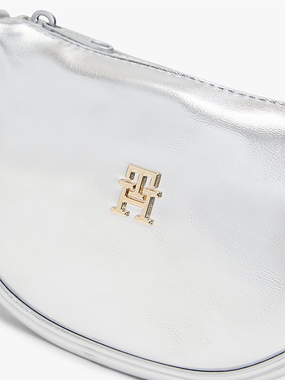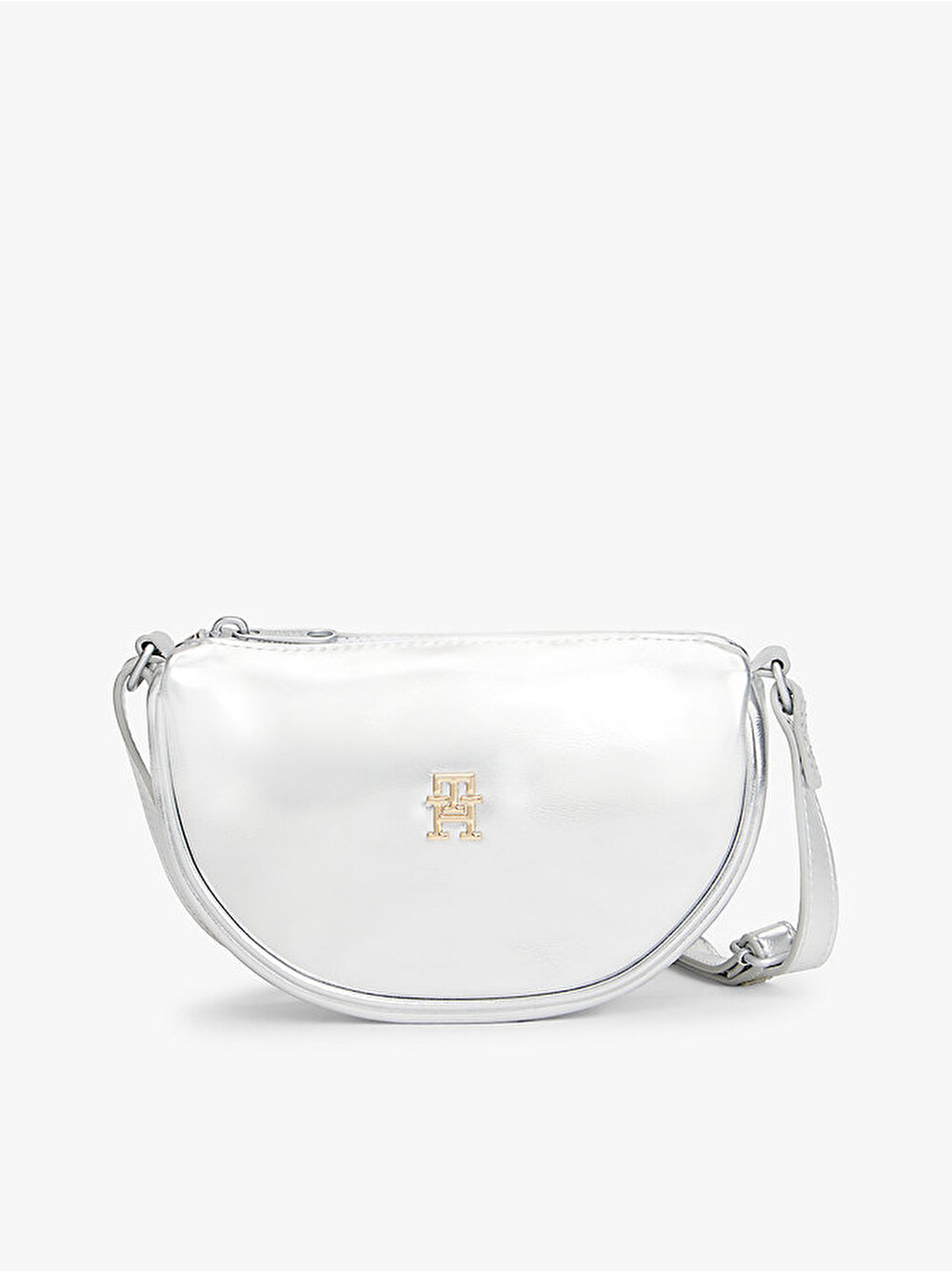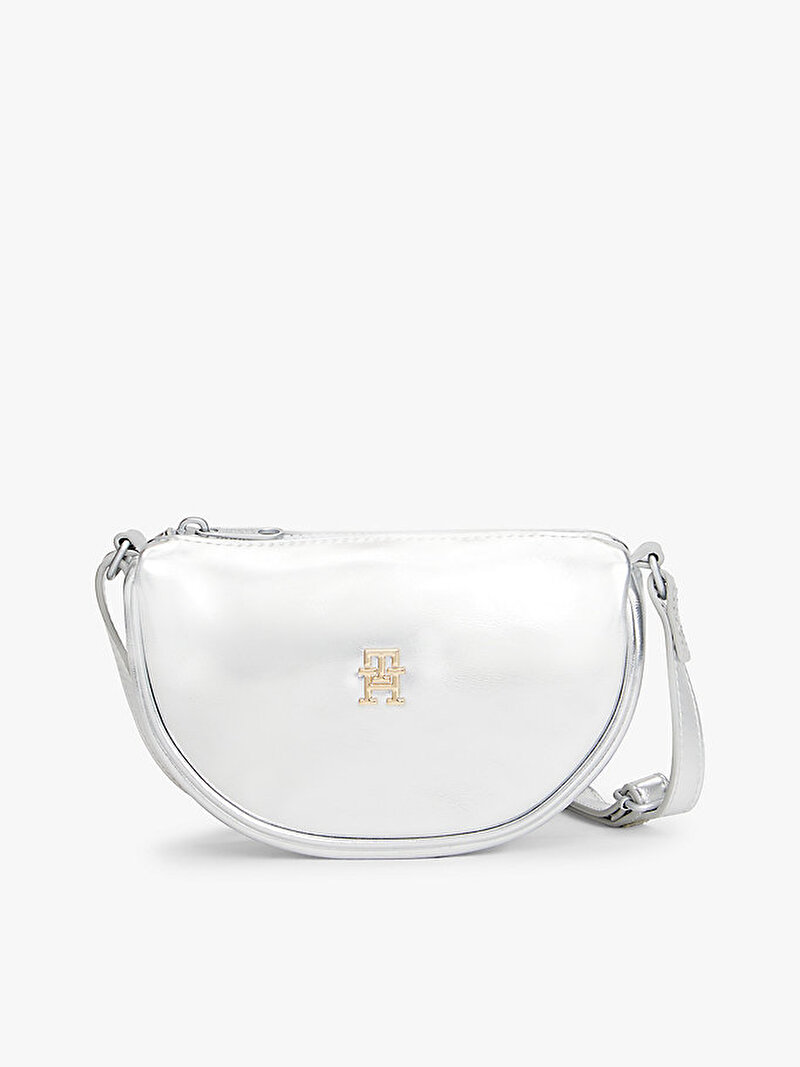 Bu hilal formundaki crossbody çanta, parti ihtiyaçlarını taşımak için ideal boyuttadır ve kombinlere metalik bir ışıltı katar.