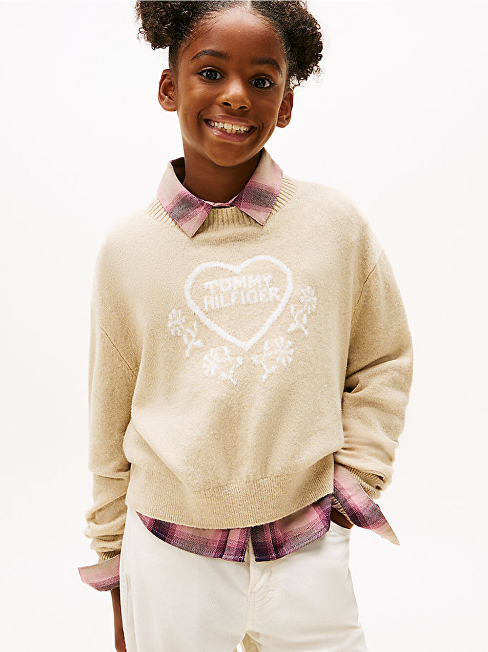 Intarsia jakarlı kalp logo tasarımına ve rahat elastik örgülü süslemelere sahip bu kazak ile hafta sonu kıyafetlerine bir tutam sevgi dokunuşu katın.