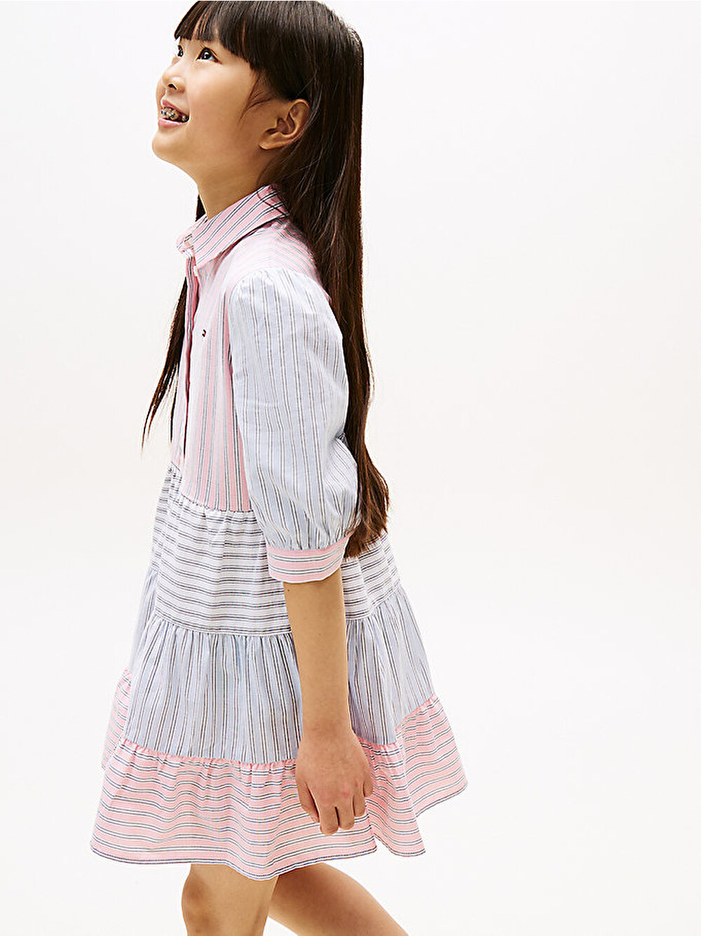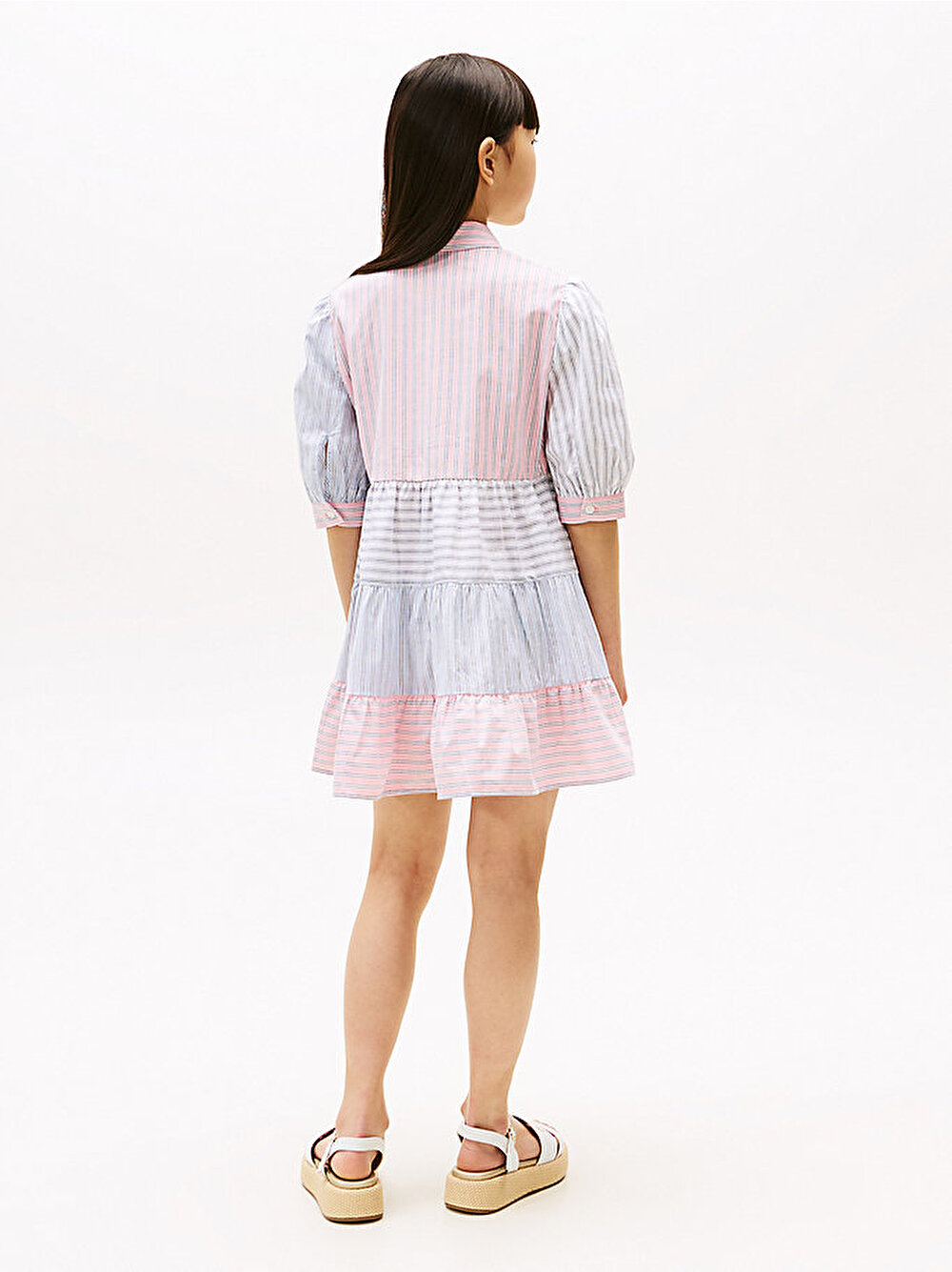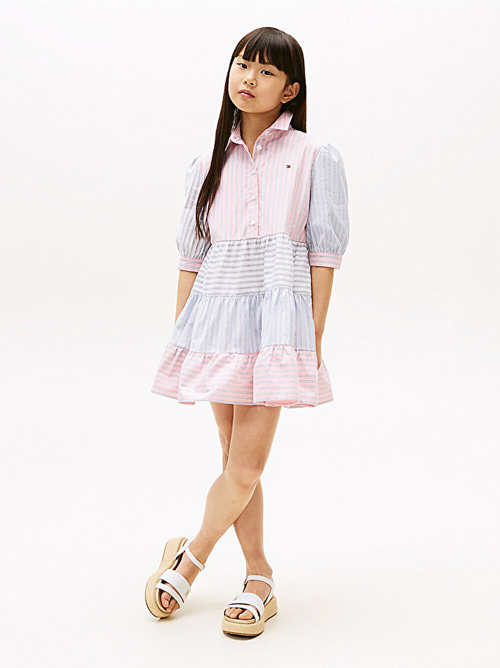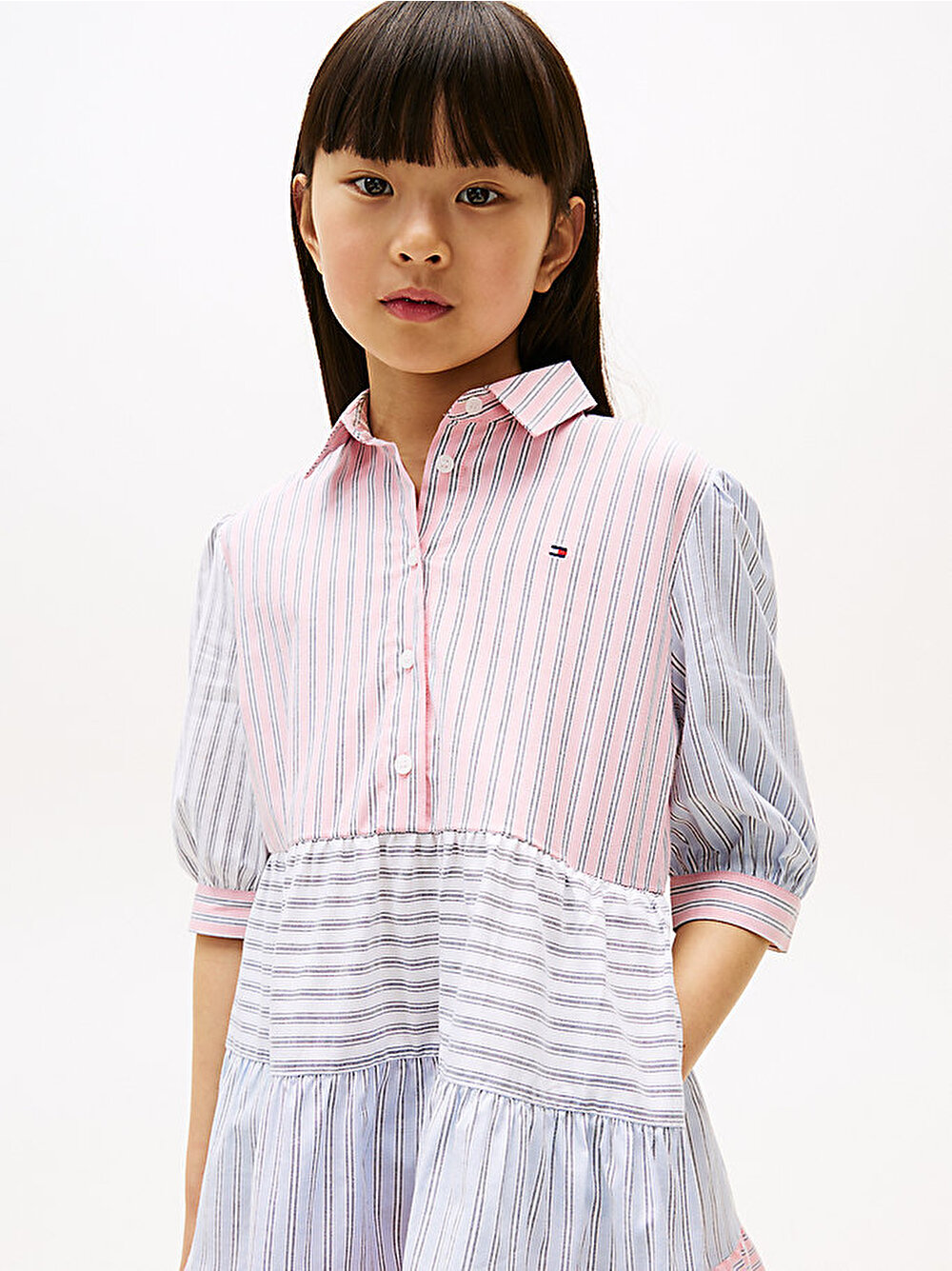 Bu esnek pamuklu elbise, klasik gömlek stilinden ilham alıyor ve karışık çizgileri katlı tasarımla birleştirerek eğlenceli bir görünüm sunuyor.