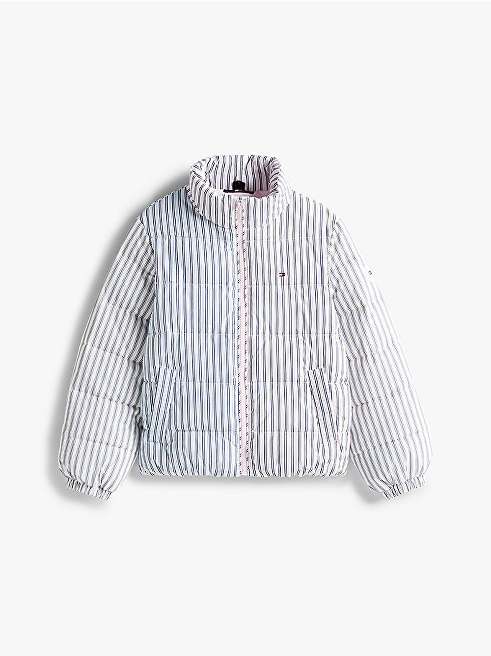 Bu şişme mont, canlı karışık çizgili tasarımıyla öne çıkarken, yüksek yakası ve rahat dolgusu sıcaklığı korur.