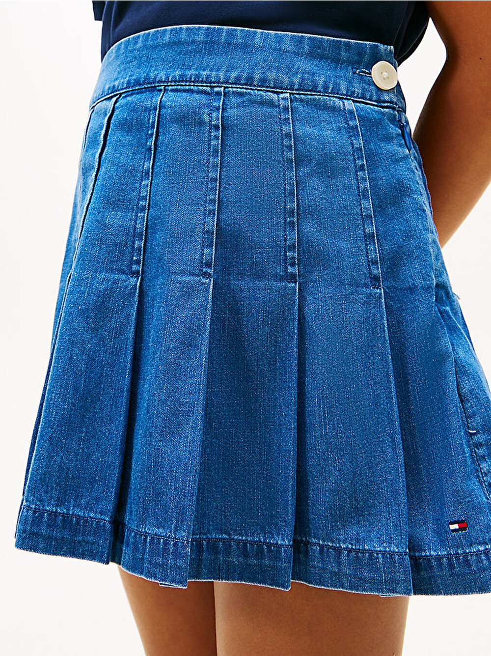 Ferah ve modern bir görünüm için bu denim mini etek, mükemmel bir kıvrım yaratmak için etek ucunun etrafında pilelerle tasarlanmıştır.