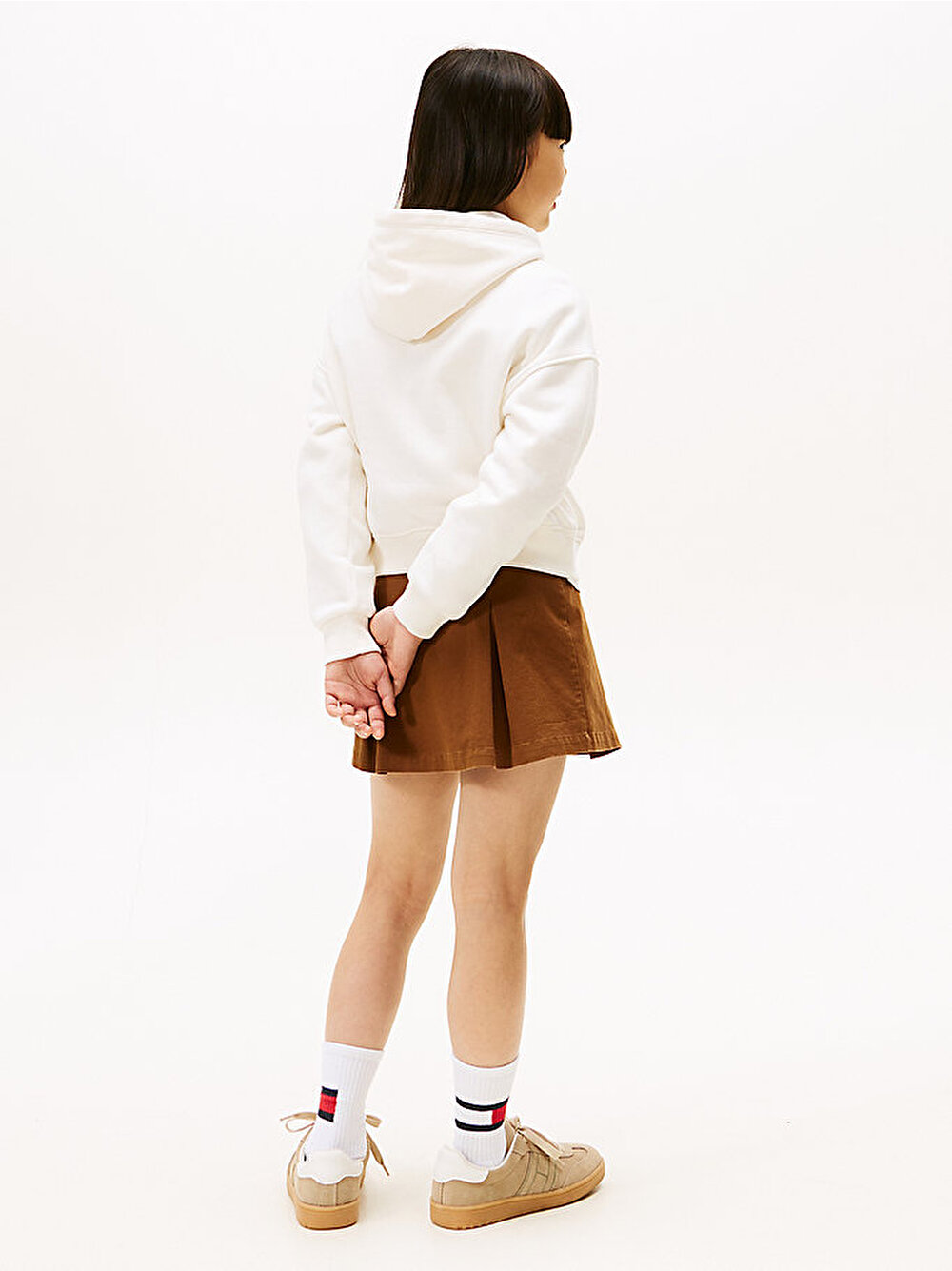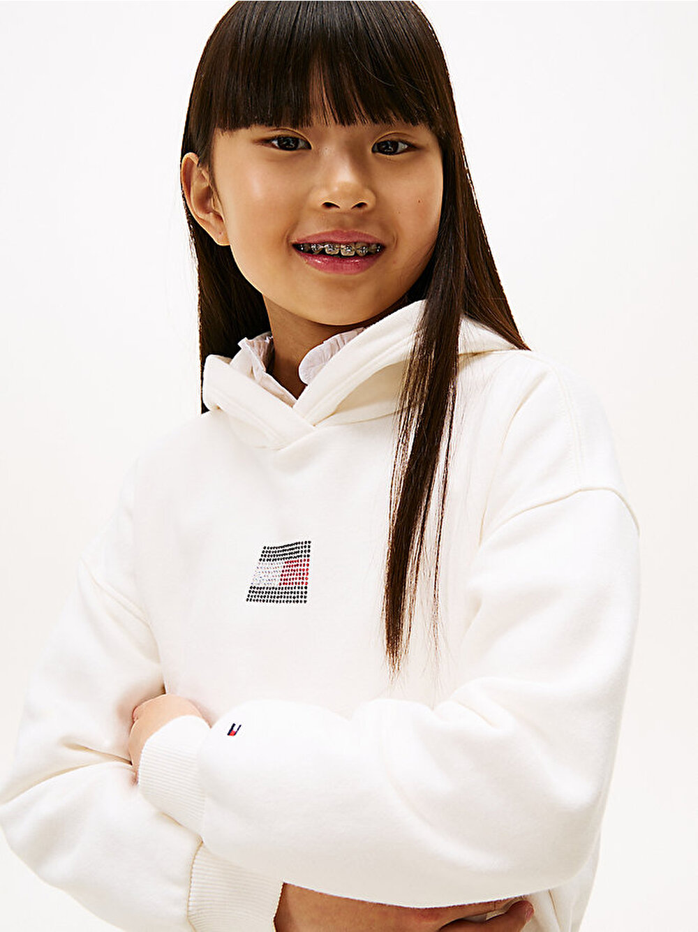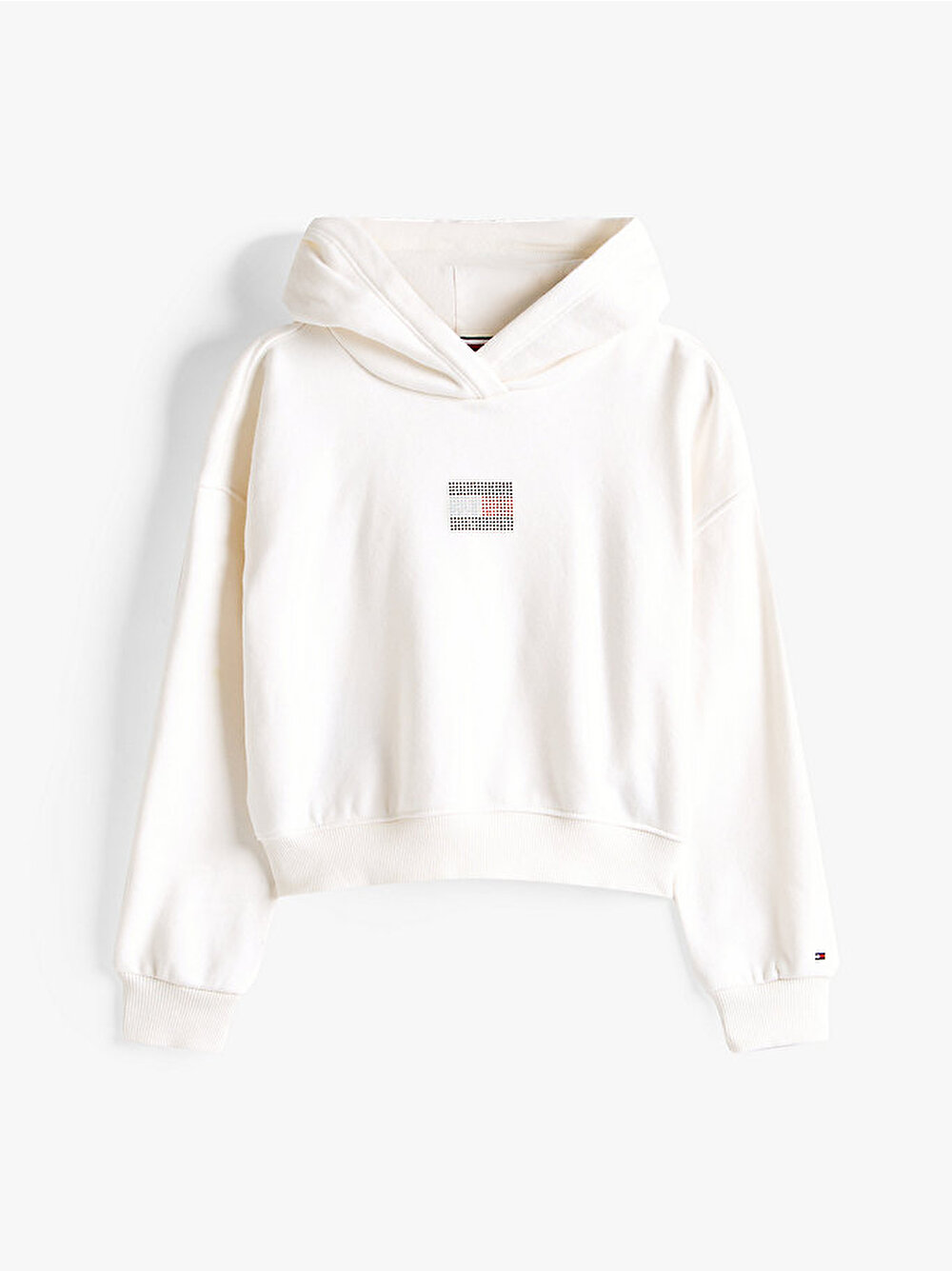 Göğsünde göz alıcı bir taşlı bayrak bulunan bu rahat polar kapüşonlu üst ile günlük görünümünüze biraz ışıltı katın.