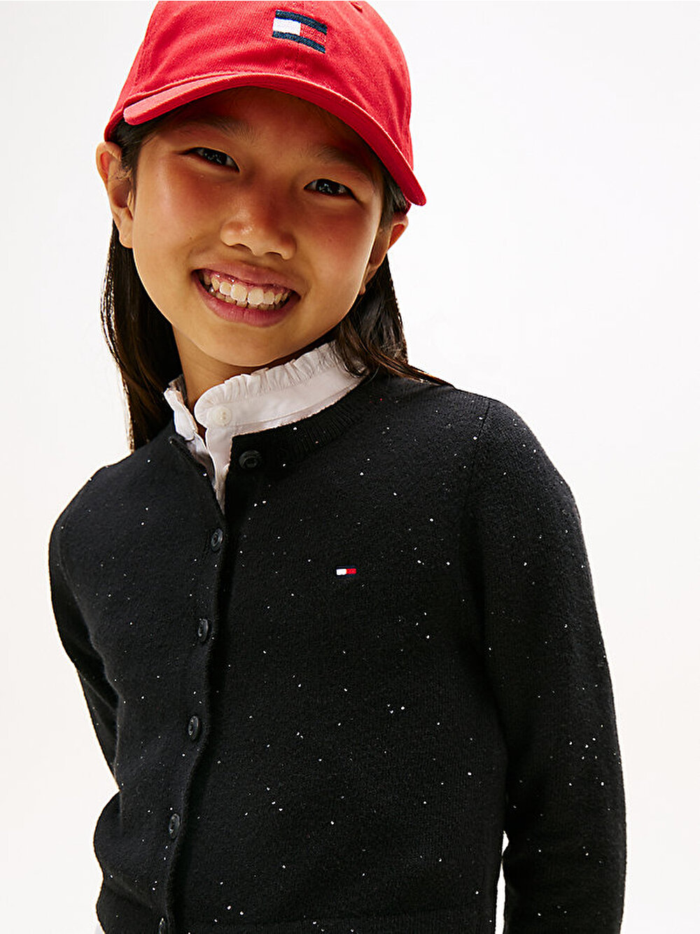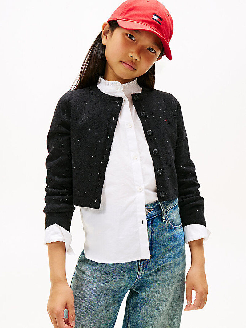 Bu ribana örgü hırka, bisiklet yaka kesimi ve ışıltılı payetleriyle parti kombinlerine göz alıcı bir dokunuş katar.
