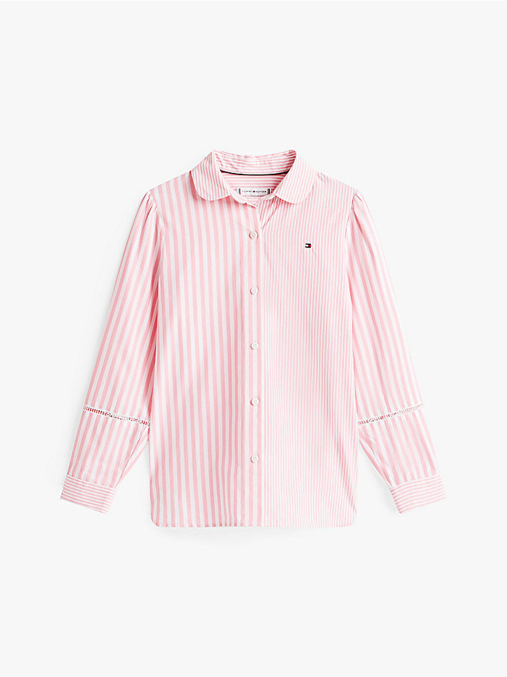 Karışık çizgili desen ve logolu dantel detayları, bu keskin saf pamuklu gömleğe oyunbaz bir hava katıyor.