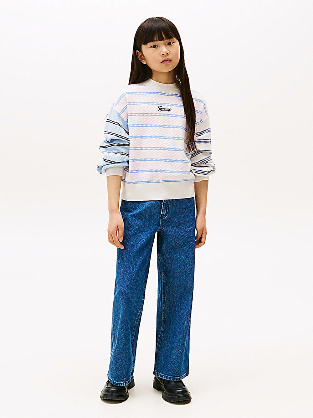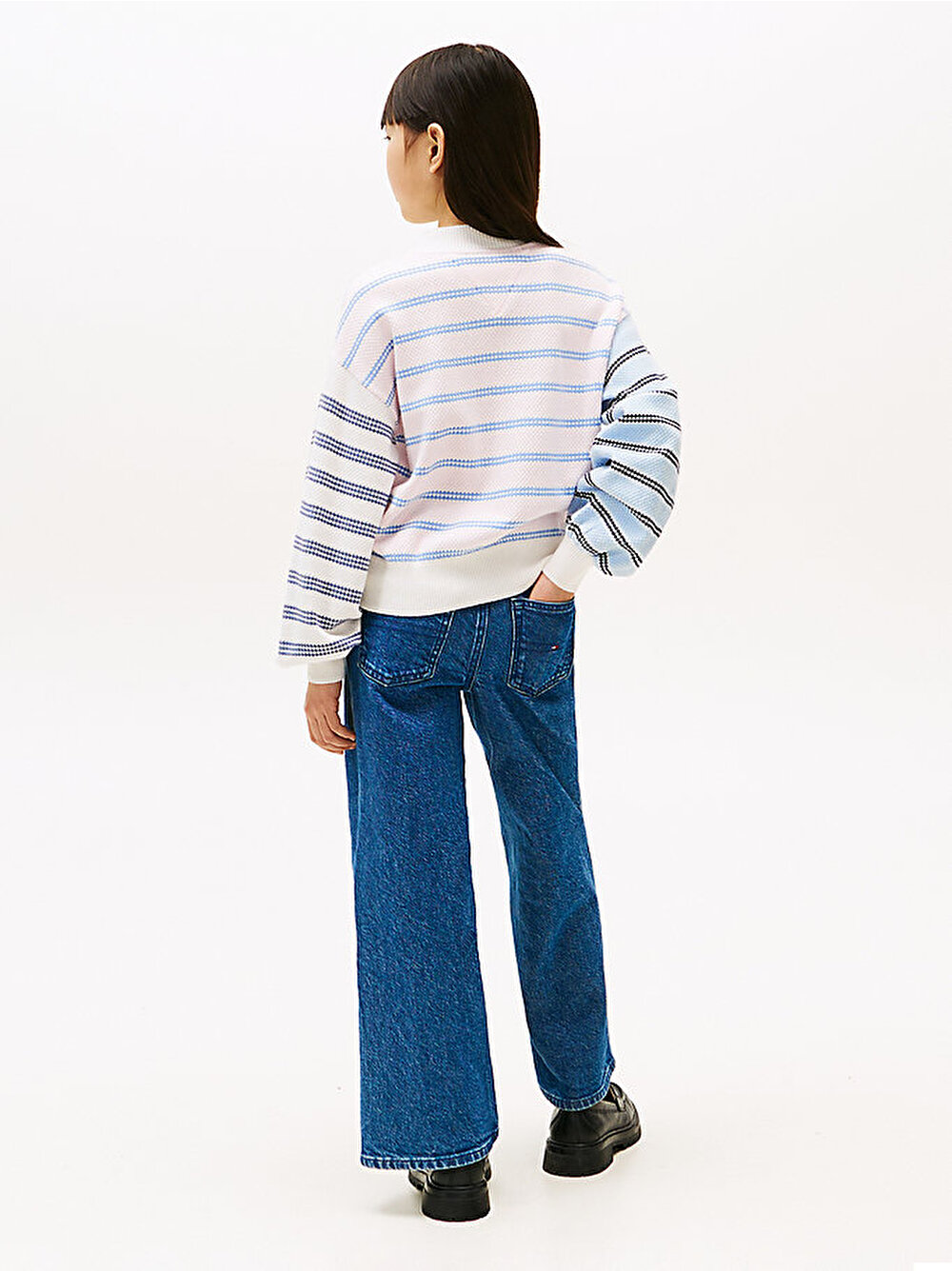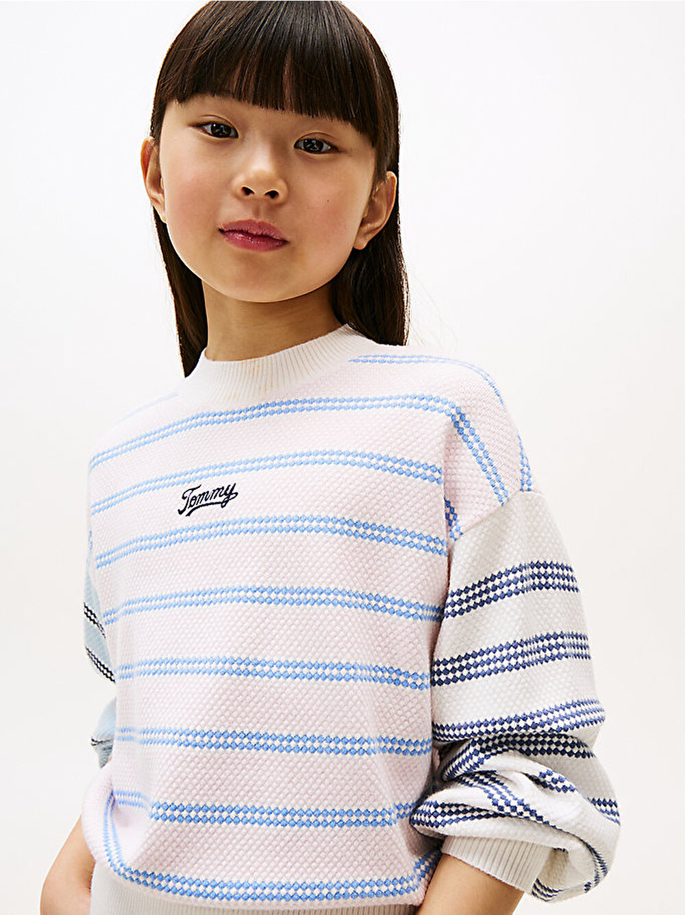 Balon kollar ve dokulu karışık çizgili örgü, salaş ve rahat kesimli bu kazağa eğlenceli bir hava katıyor.